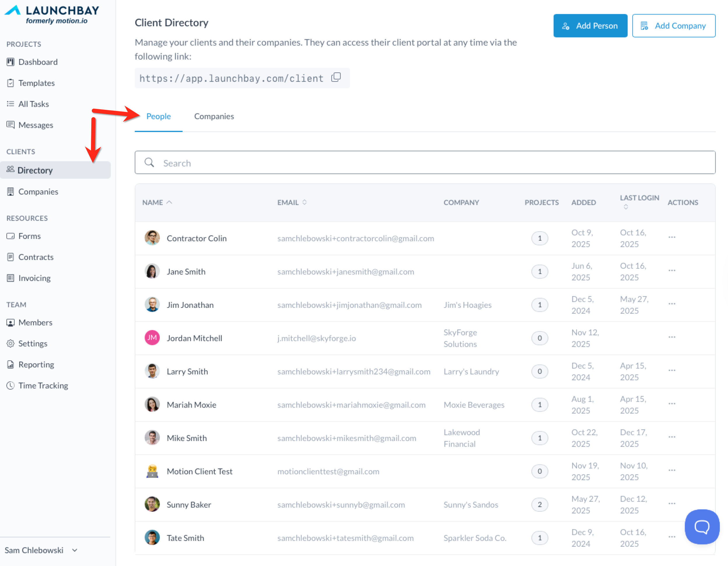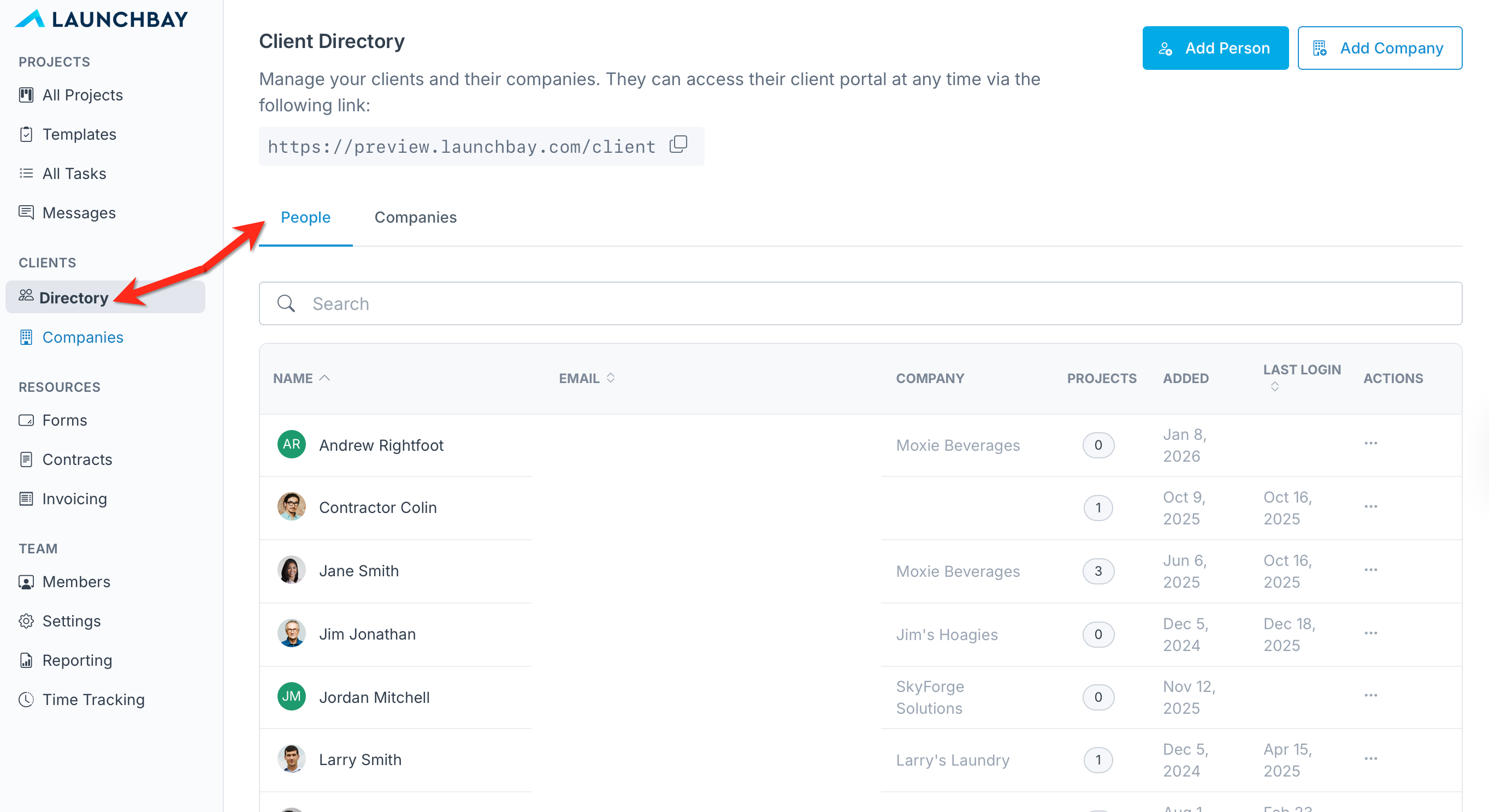 This article will explain how to create and manage people in LaunchBay's Client Directory and the information you can access.