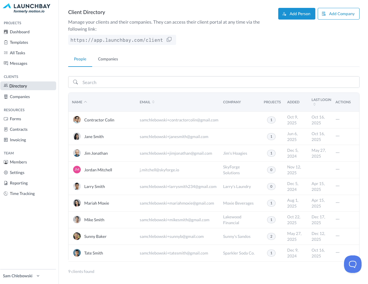 LaunchBay's built-in Client Directory allows you to add your clients to LaunchBay and have a full view of them, the projects they're on, the emails they've opened, and more.