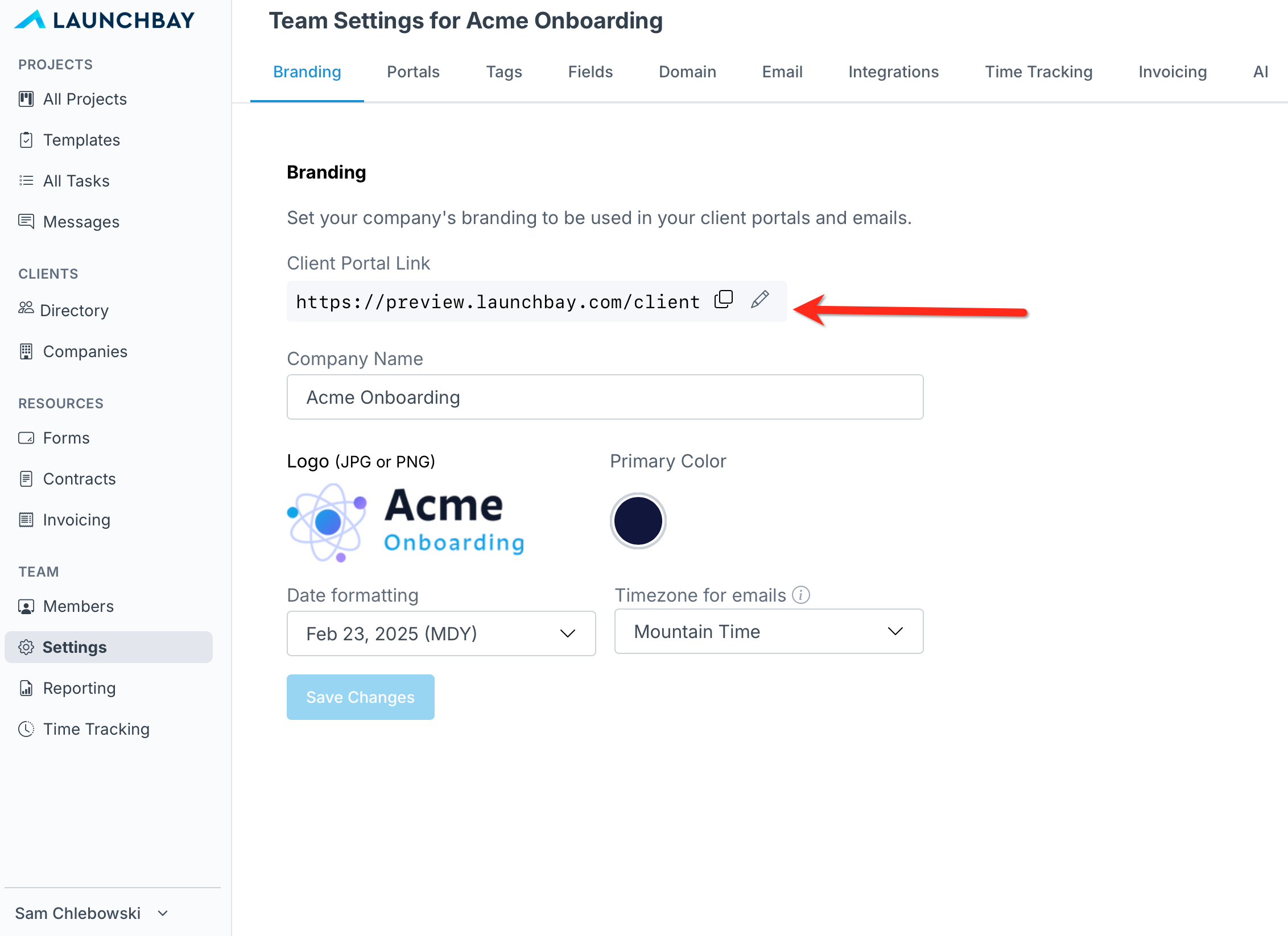 🏆 Tip: The default URLs for Client Login Pages are yoursubdomain.launchbay.com/client for magic link portals and yoursubdomain.launchbay.com/client-login for password-protected portals. If you upgrade to LaunchBay's Scale prise plan and configure your white-label settings, these links will automatically update to your custom domain.