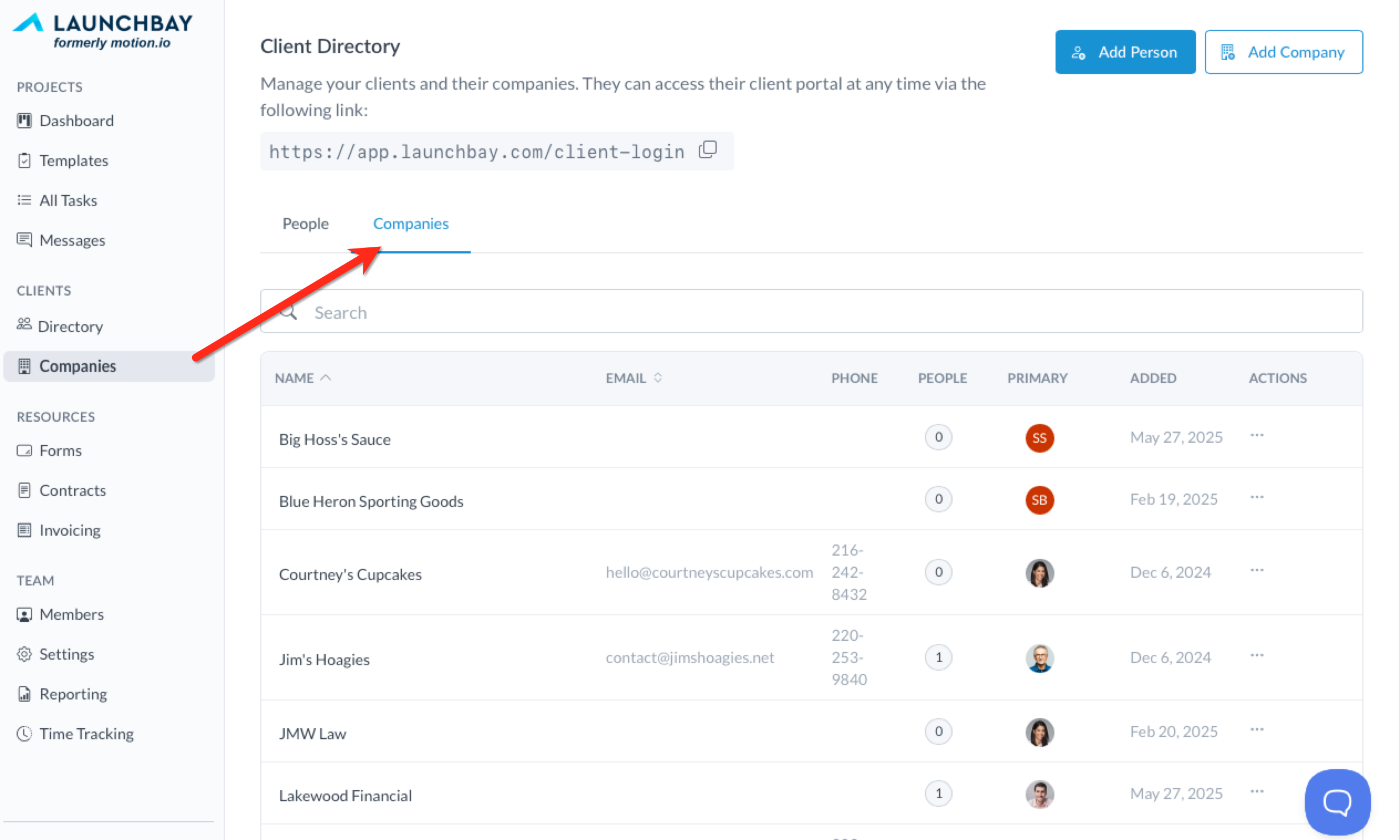 When you create a new company, it will not have any clients associated with it. To add clients to a company, click on the "People" tab of the LaunchBay CRM.