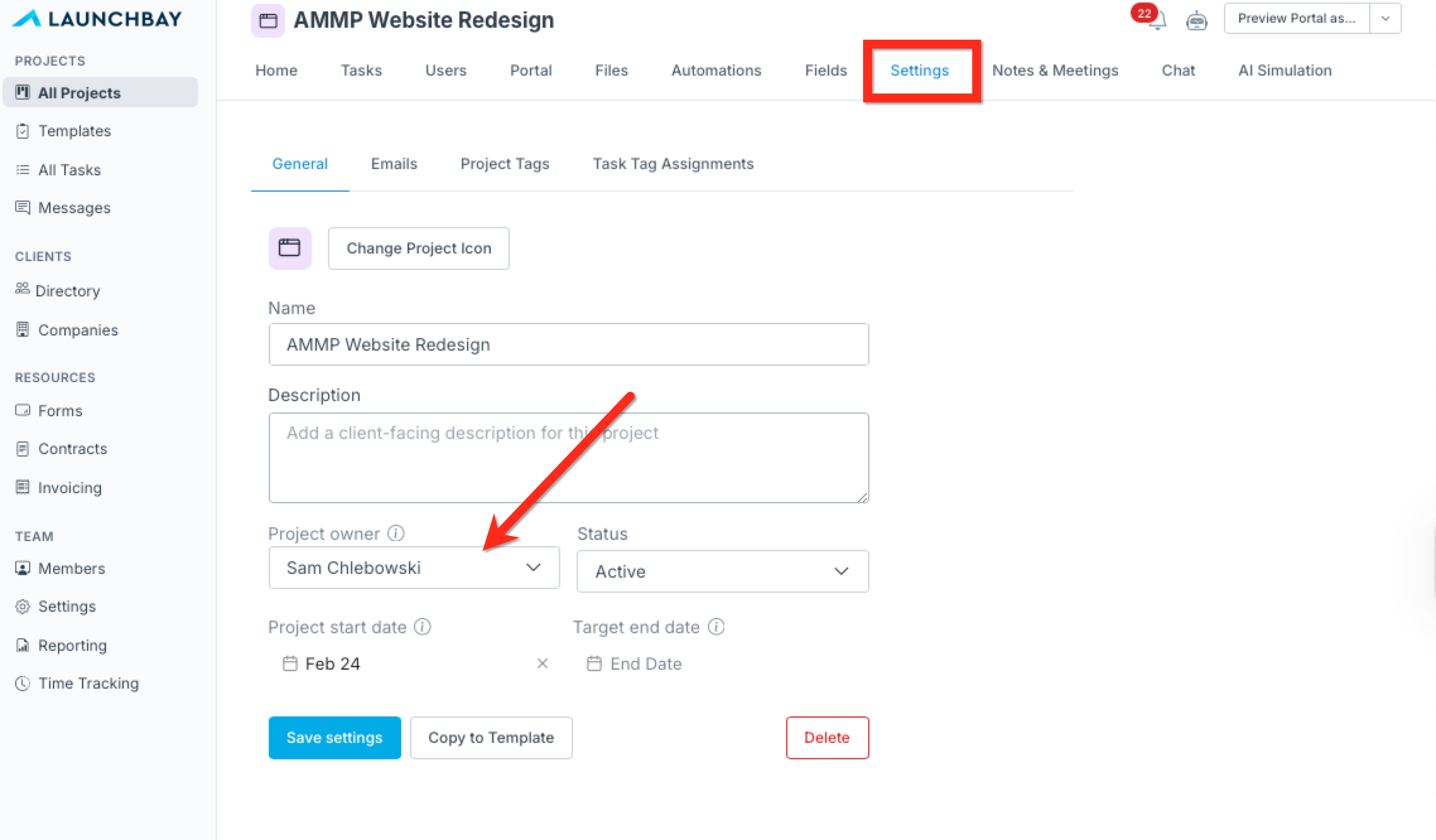 Once you have added your team member to the project, click "Settings" from the top navigation menu. In the "General" tab, select a new project owner from the dropdown menu.