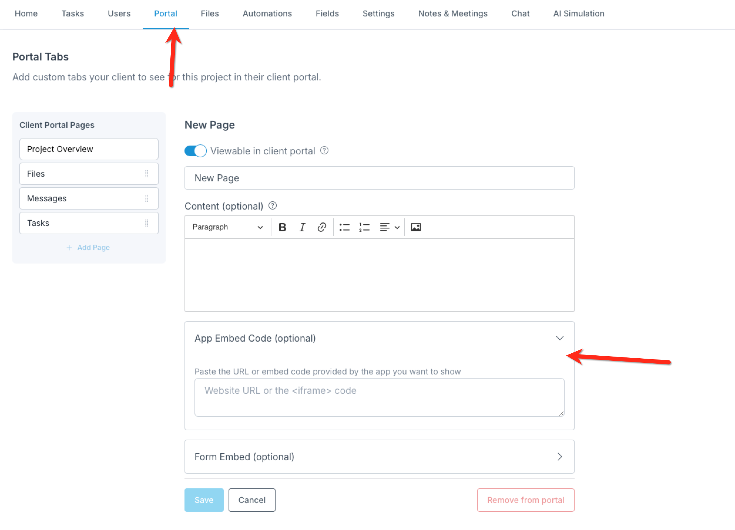 In your LaunchBay account, select the project you’d like to add the Clockify report to, click “Portal” and then +New to add a new portal tab.