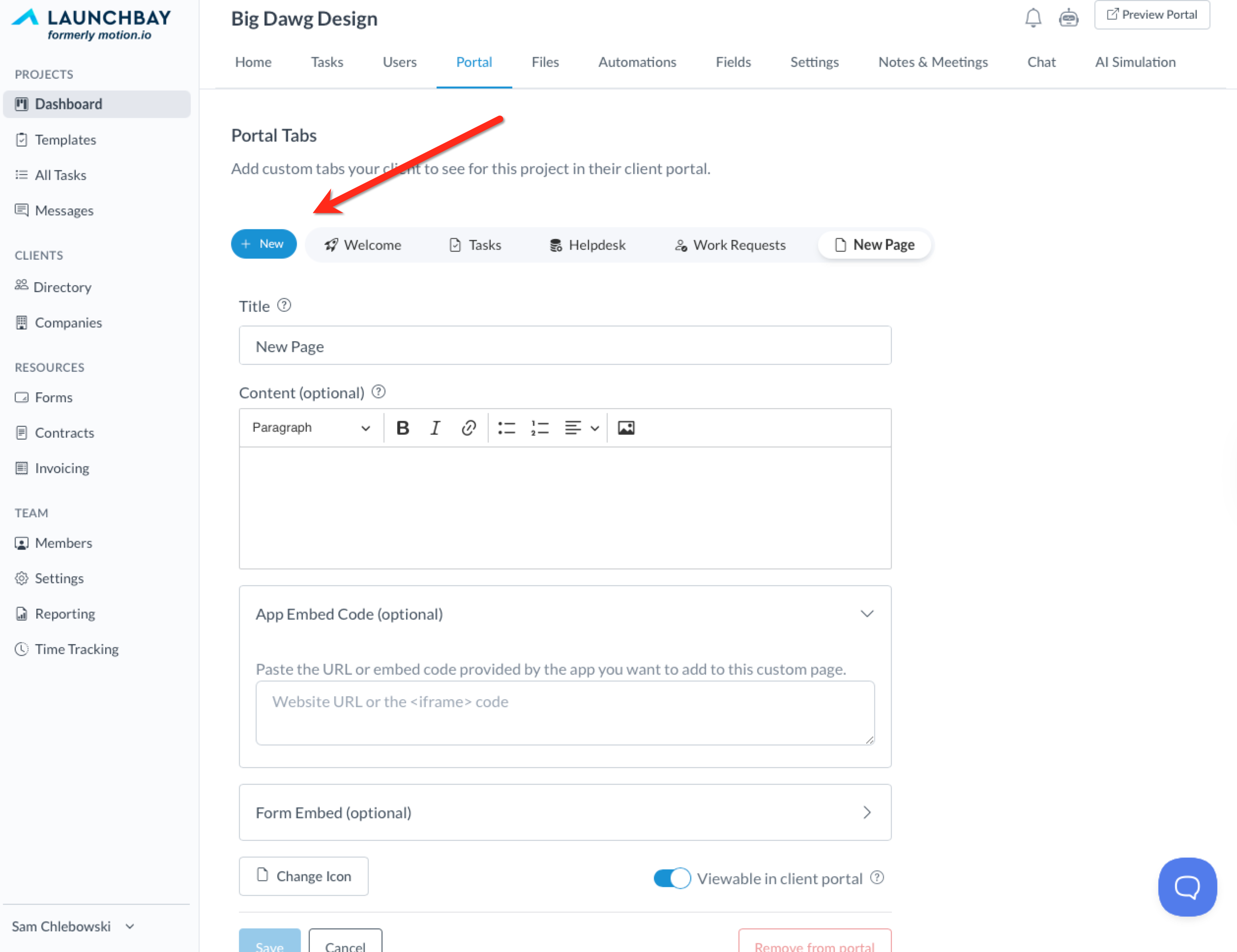 In your LaunchBay account, select the project you’d like to add the Monday.com board to. Click “Portal” from the options at the top of your screen, and then click “+New.”