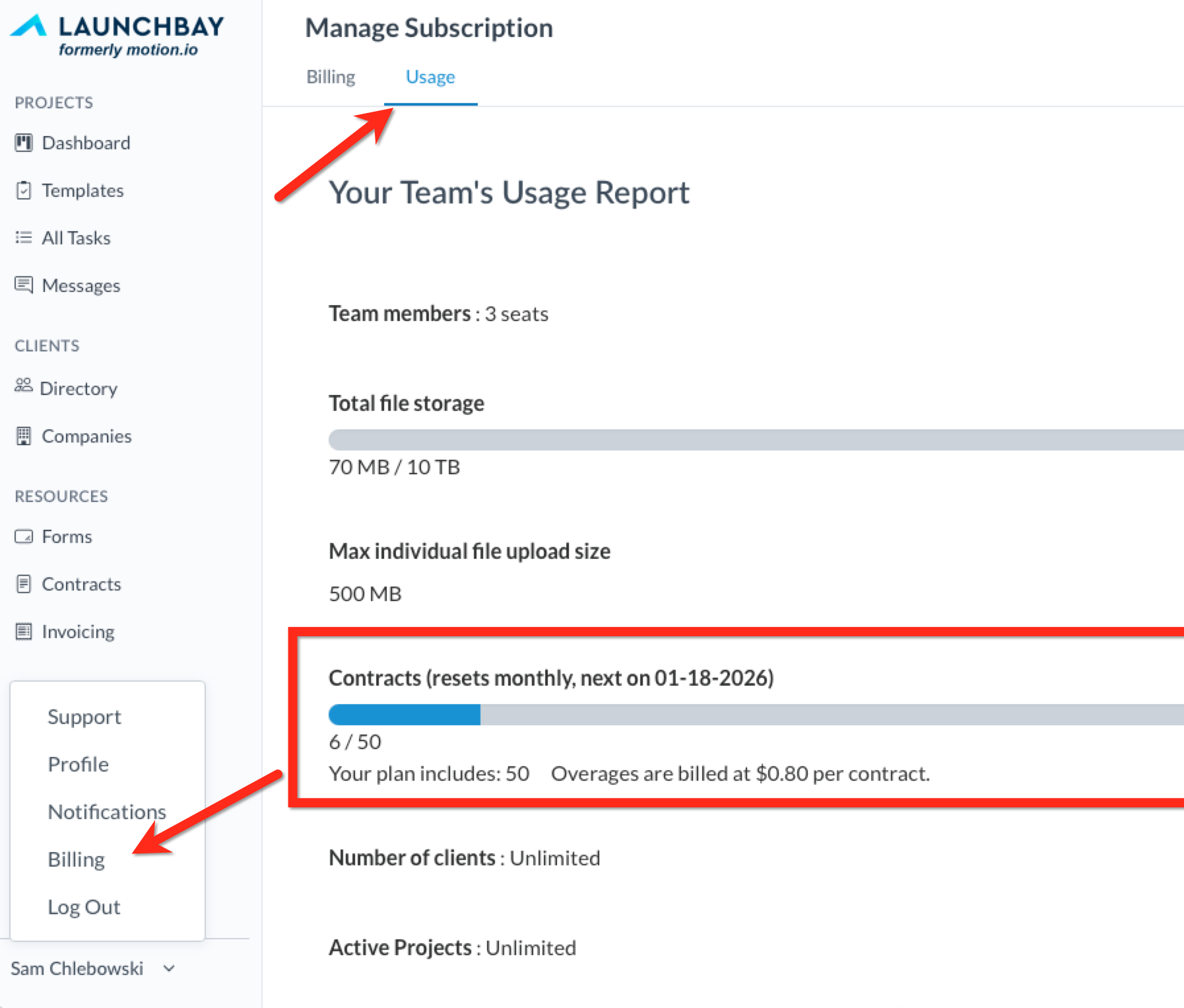 Each of LaunchBay's subscription plans contains a limit on the number of Contracts you can send per month. This article will explain how to check how many Contracts you've used in a month and what types of activities count towards this limit.