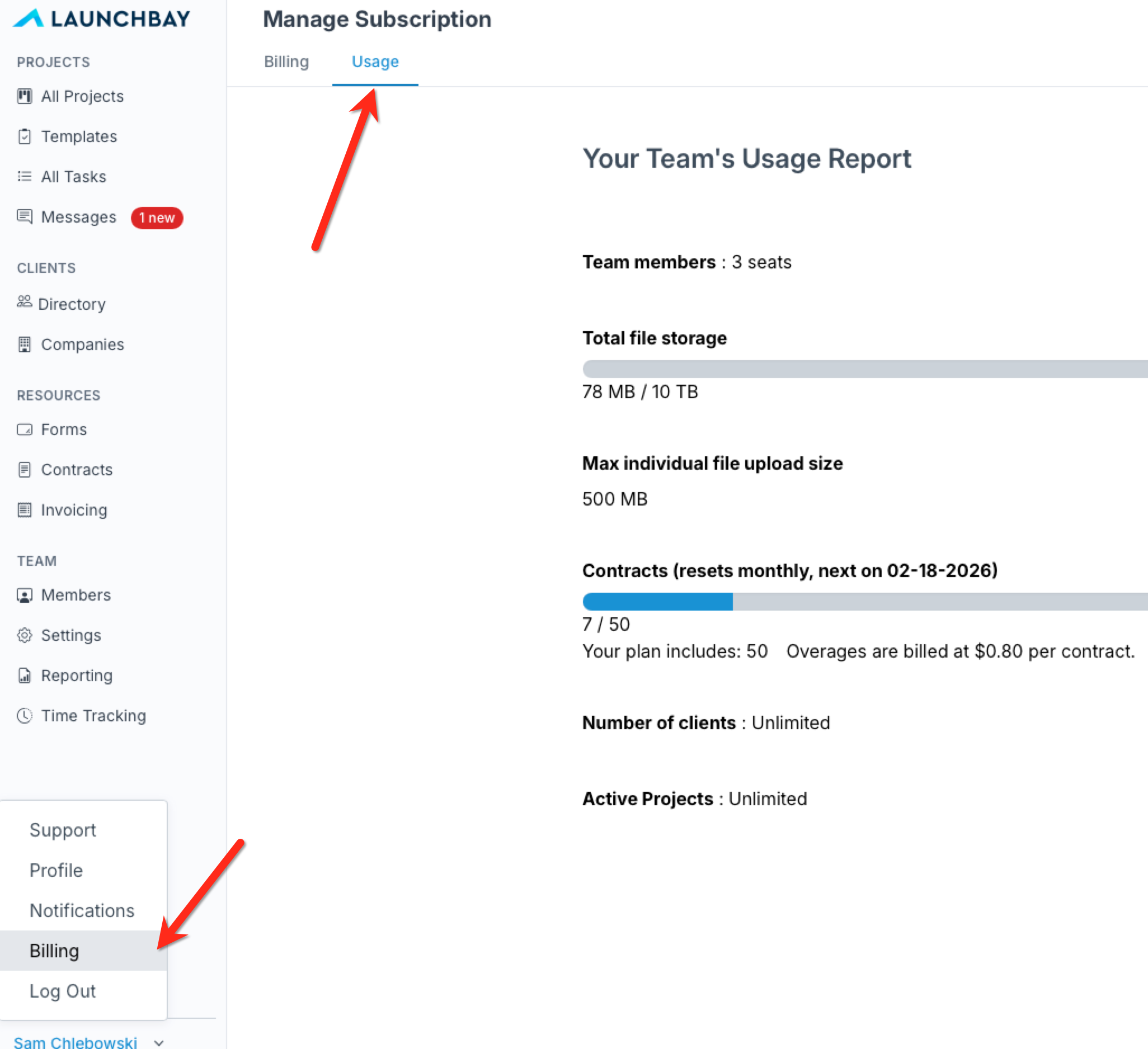 To see how many Contracts you've used in the current billing cycle, go to your account's "Billing" page and click "Usage" from the top navigation menu.