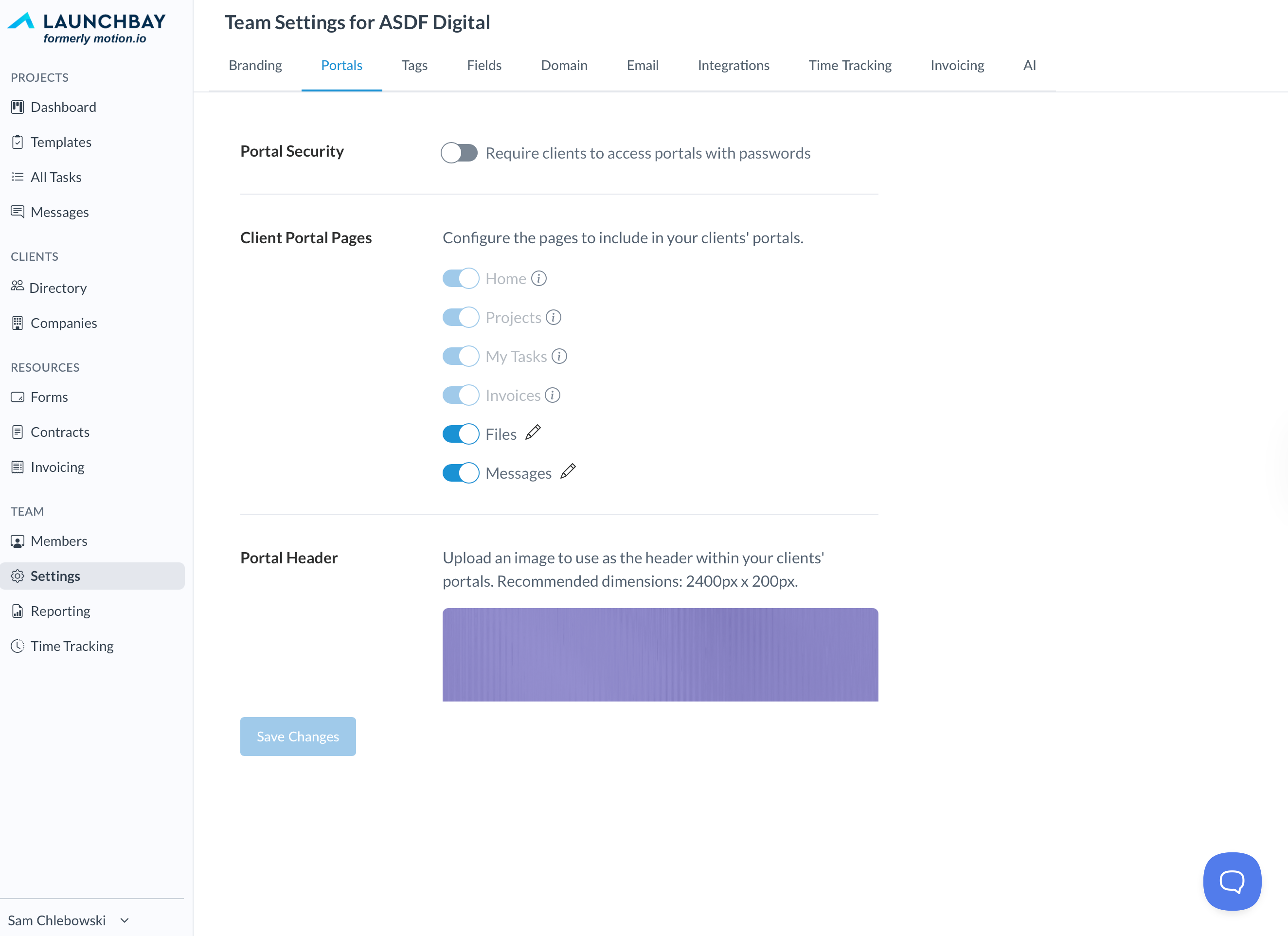 While three of the default portal pages ("Home," "Projects," and "My Tasks") are critical to clients using LaunchBay and cannot be removed from portals, your team has the option to hide the pages for "Files" and "Messages" if you do want to give clients access to them.