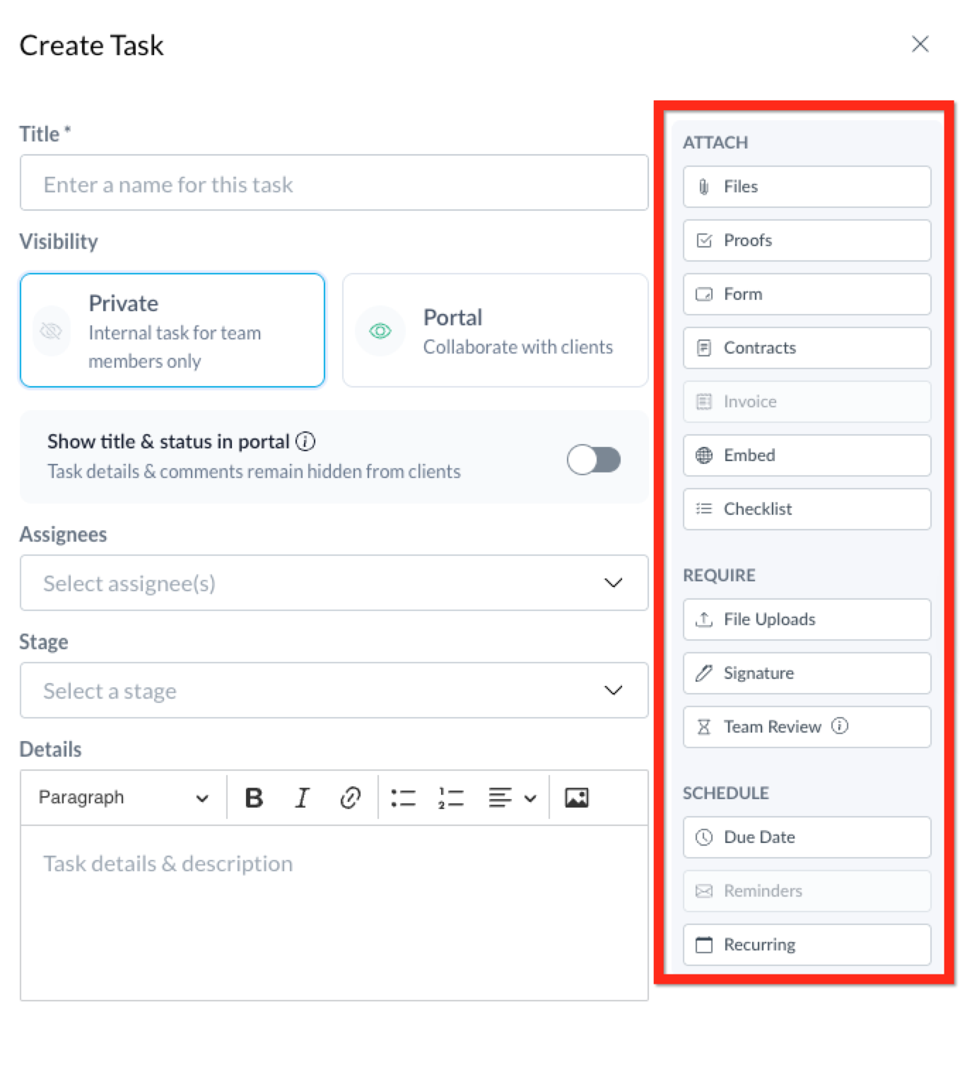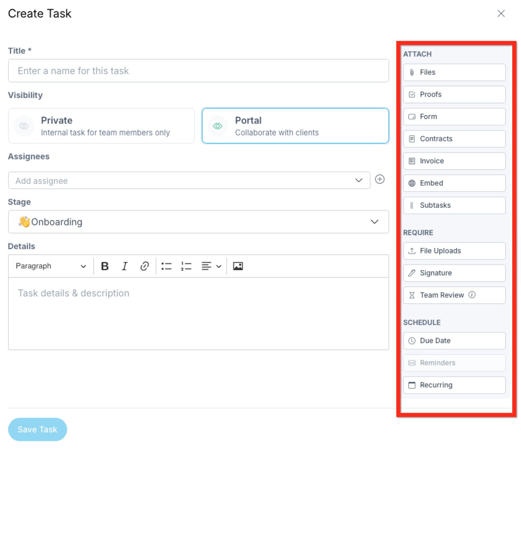 - Due Date: Specify a date by which the task must be completed by a client or team member.
