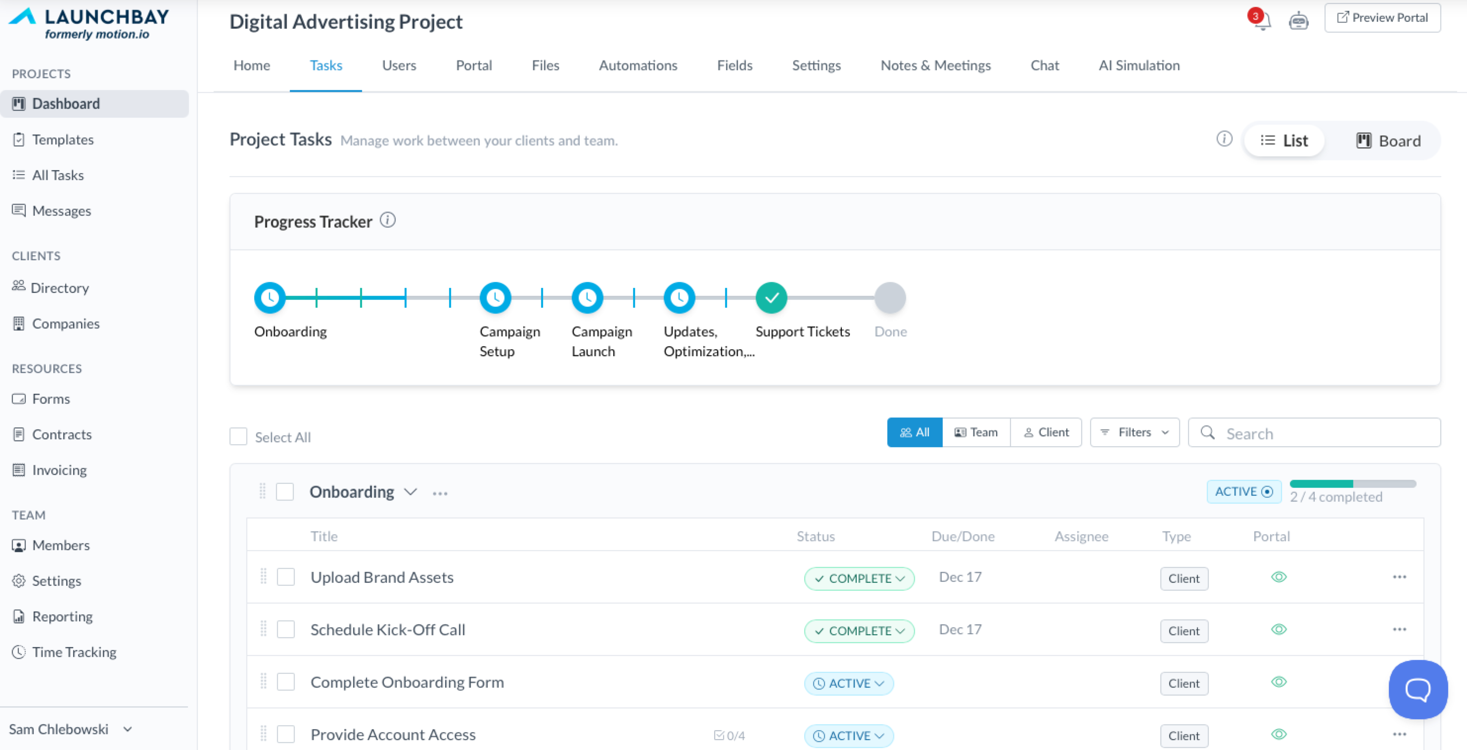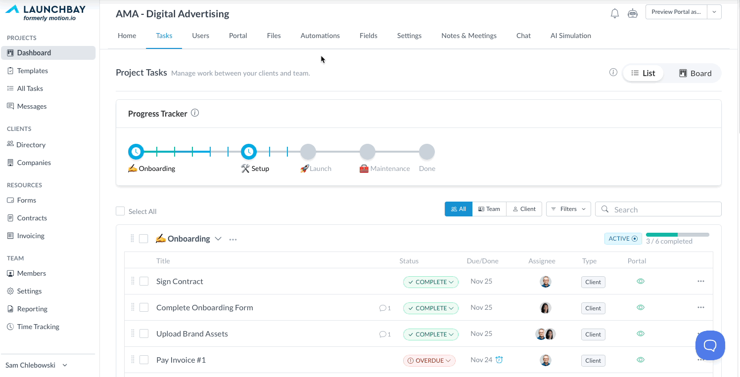 The Tasks page within your projects is the heart of project management in LaunchBay. It’s where you’ll create tasks, organize them into stages, and set up automations that streamline your client work. As projects progress, the Tasks page provides a clear, centralized workspace for your team to manage both internal and client-facing tasks—making collaboration smoother, roadblocks easier to identify, and progress easier to maintain.