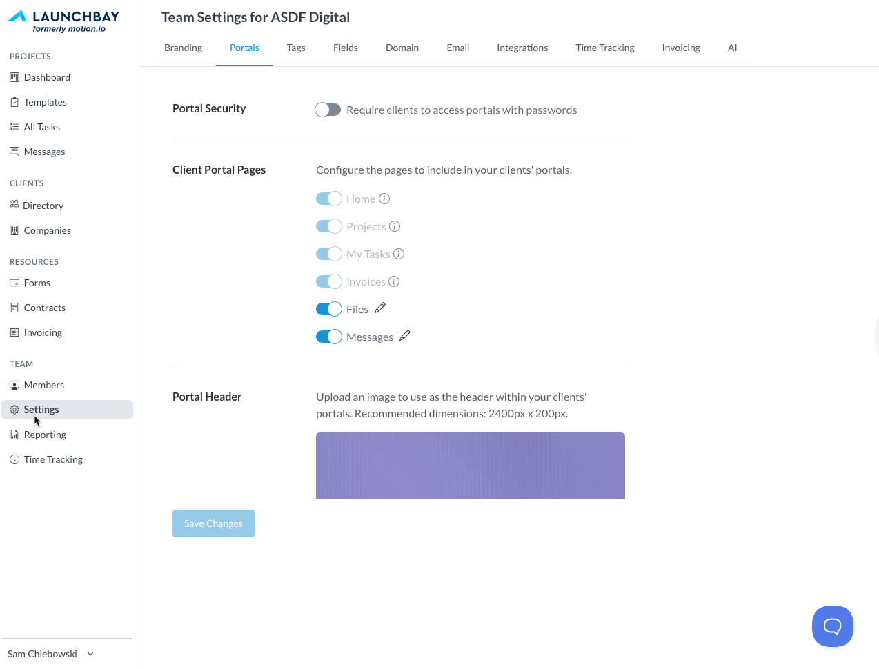 If you would like to hide the Files or Messages pages from the client portals, you can do so by going to Settings in the left sidebar and clicking the Portals tab at the top. From there you will be able to toggle the page visibility on-and-off.