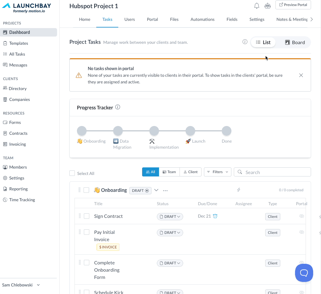 Once tasks are sent and active, your AI Client will begin working through them just like a real client would — completing tasks in order, from signing contracts and submitting forms to uploading files, reviewing proofs, and more.