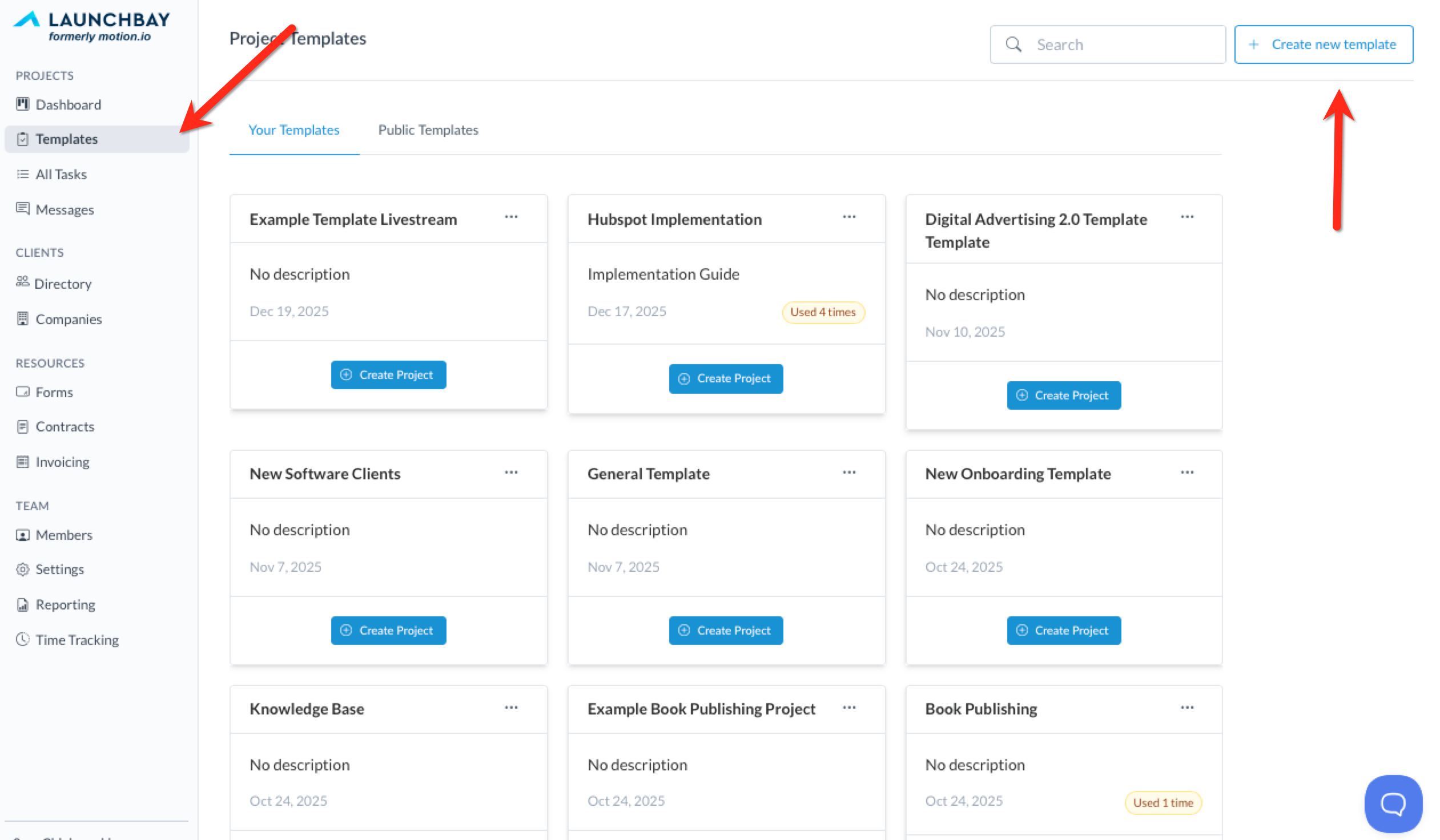 To get started, navigate to the Templates section from your LaunchBay Admin View and click “Create new Template.” Give your template a name—such as “Client Onboarding”—then assign a project owner. Once you've entered the required details, click “Create” to launch the template builder.