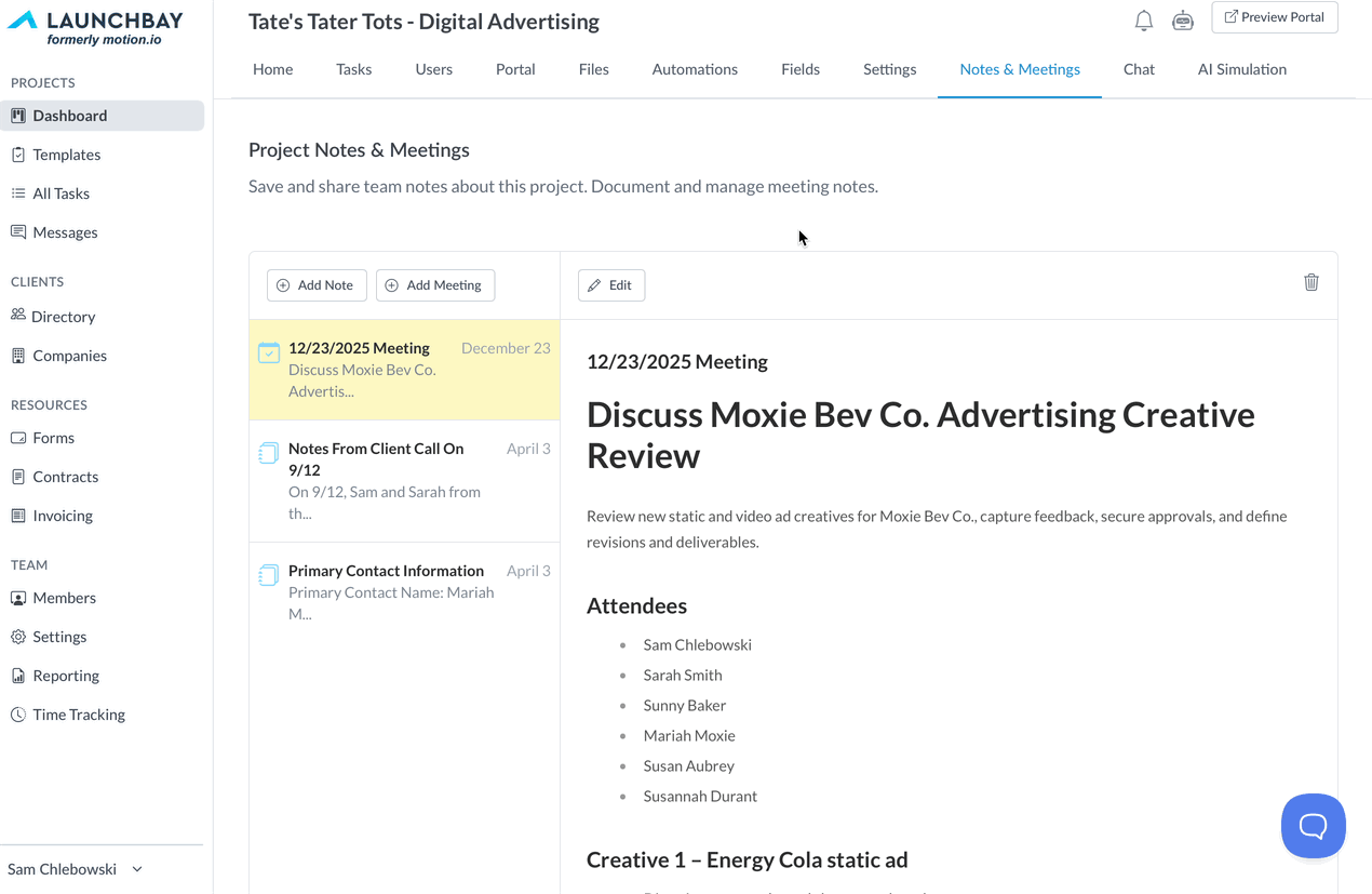 If you meet with clients regularly—whether to align on strategy or review in-progress work—you’ve likely run into the challenge of documenting and acting on meeting takeaways. LaunchBay’s AI Meeting Notes feature helps you bridge that gap by turning meeting transcripts into clean summaries and pre-built task suggestions for both clients and internal team members.