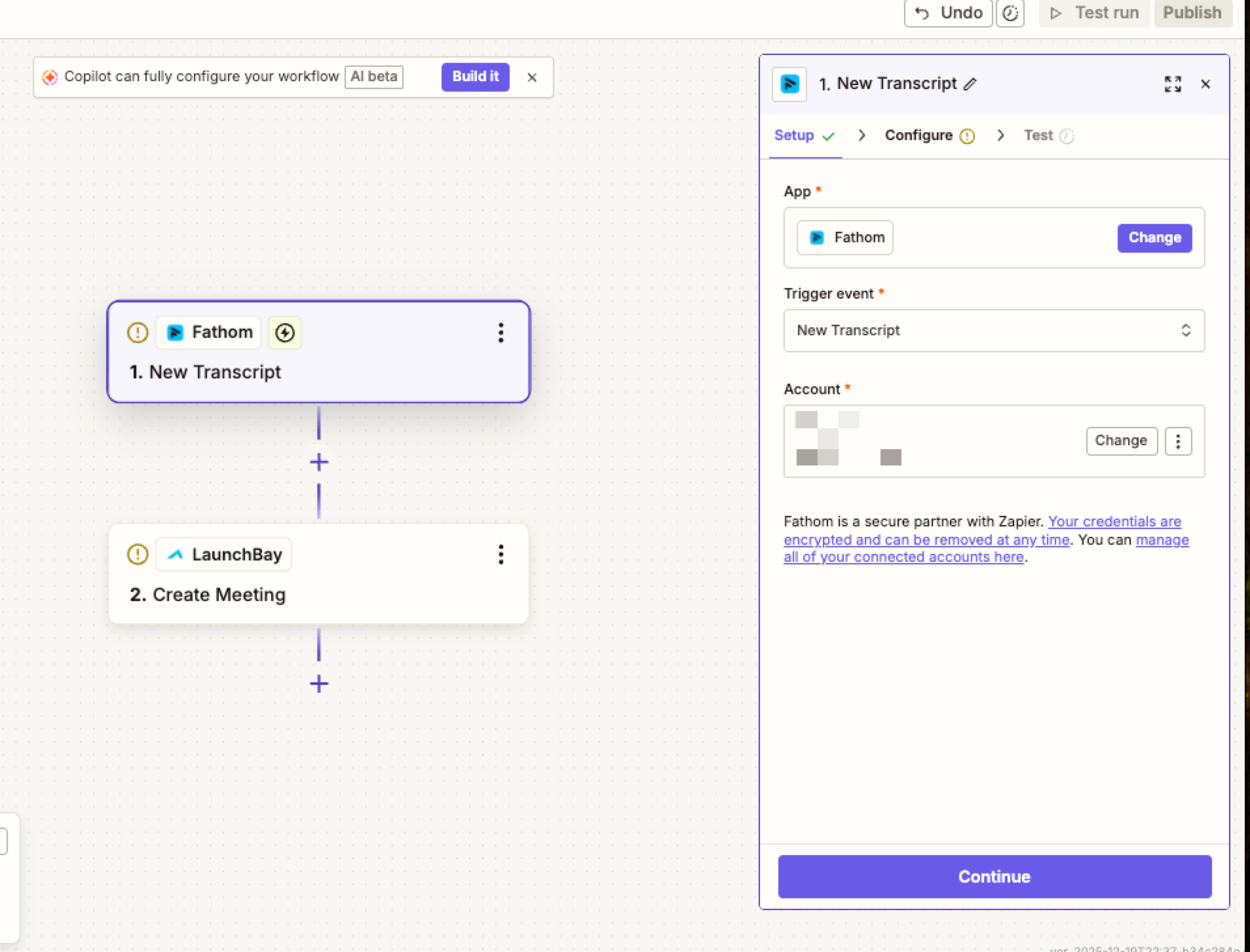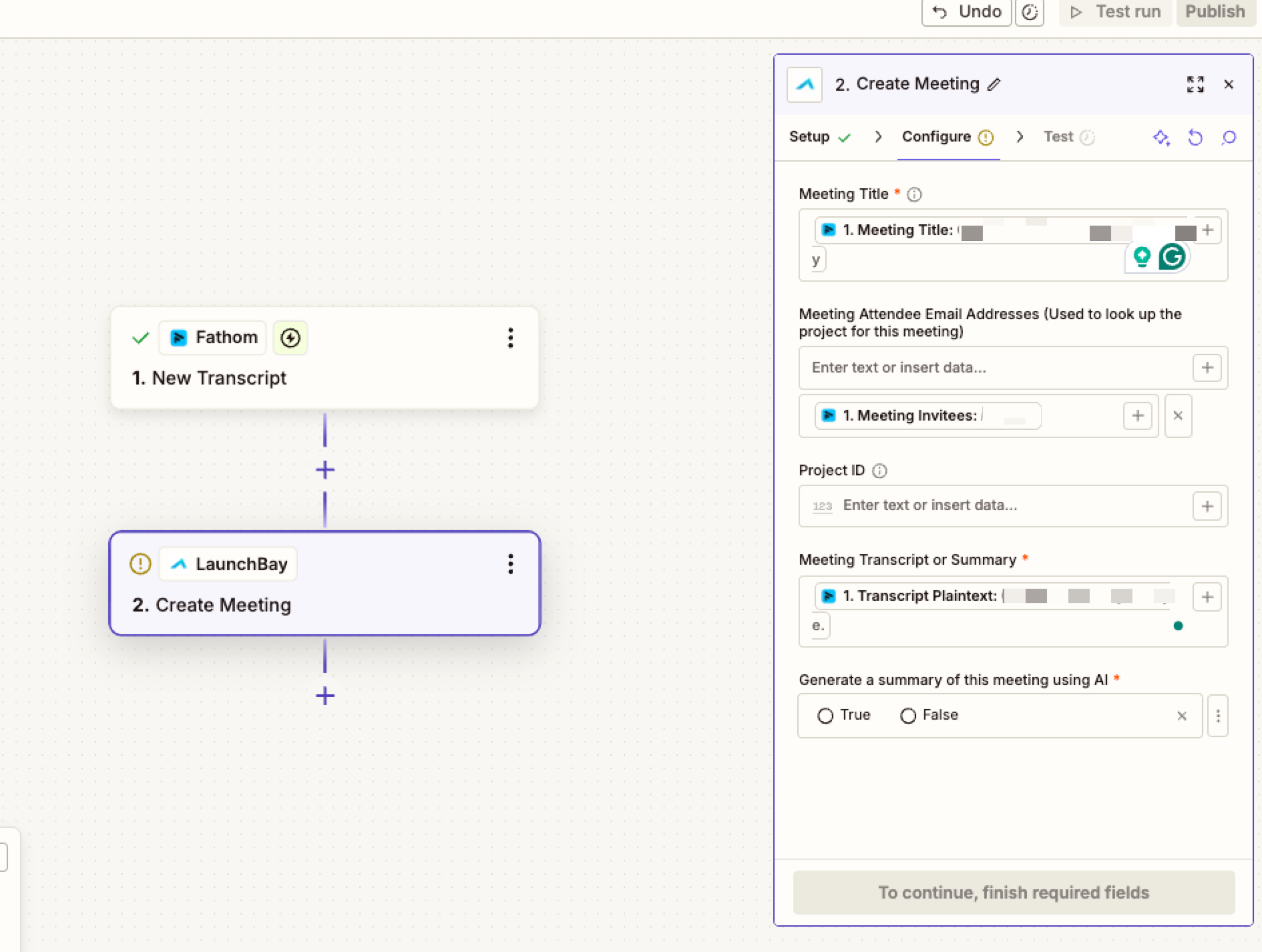 Once you’ve connected your LaunchBay account, Zapier will present a configuration screen where you can map data from your transcript to LaunchBay fields. This includes