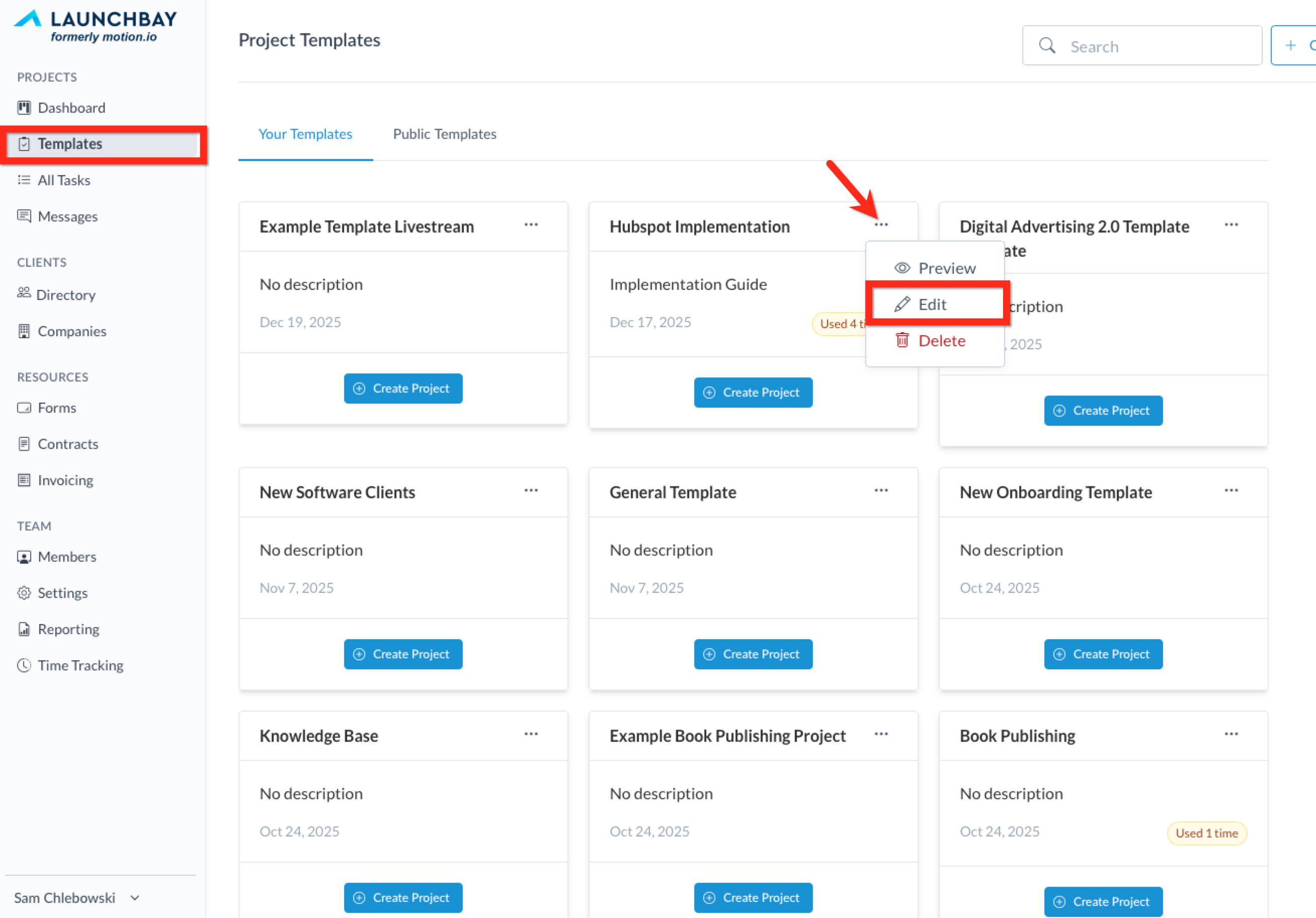 In your LaunchBay account, click "Templates" from the sidebar on the left. In the "Your Templates" tab, open the actions dropdown by clicking the three dots in the upper right corner and select "Edit" from the actions.