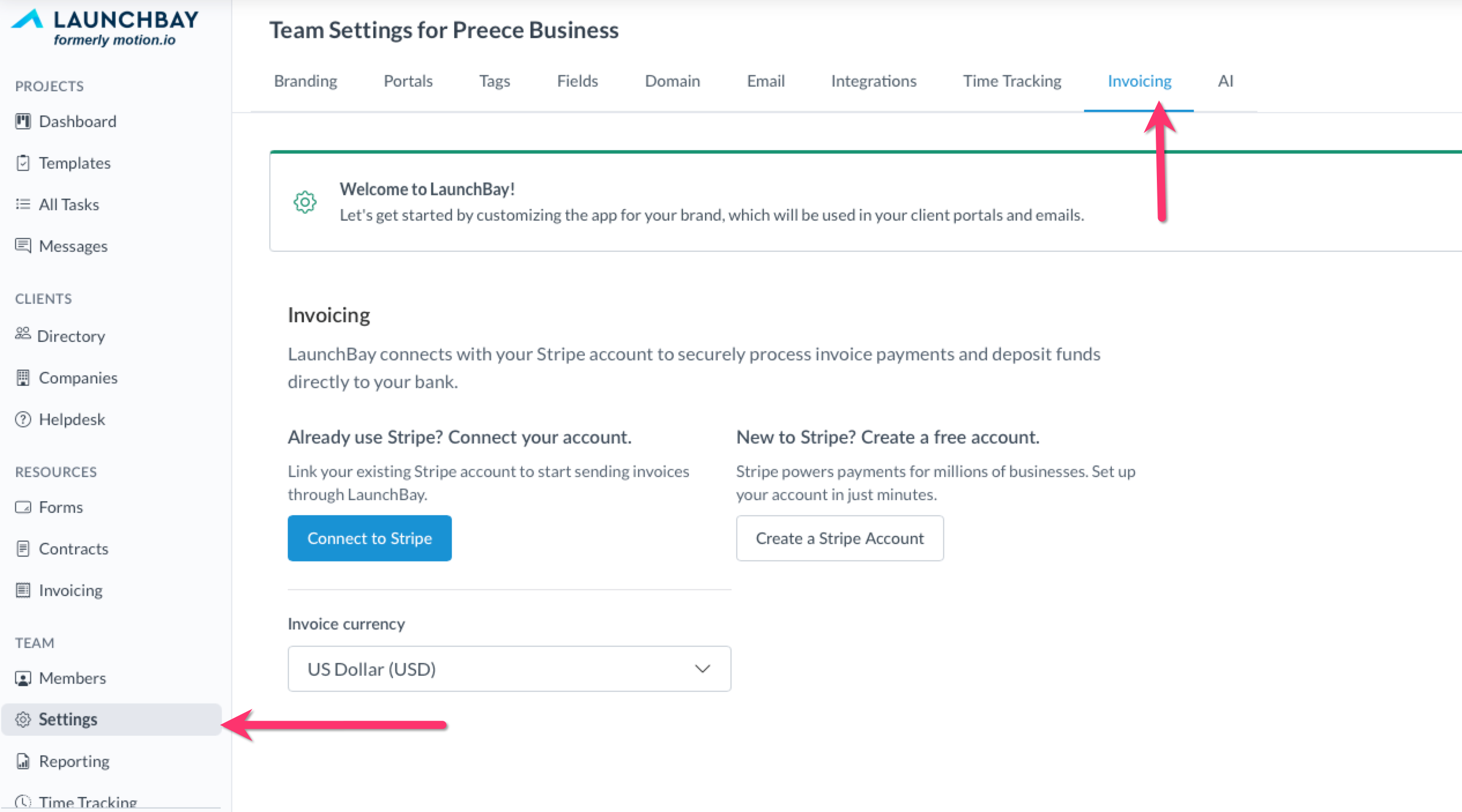 First, start by connecting your Stripe account by accessing your Settings in the left-hand menu and selecting "Invoicing" from the top navigation tabs. You can also set your currency preferences here.