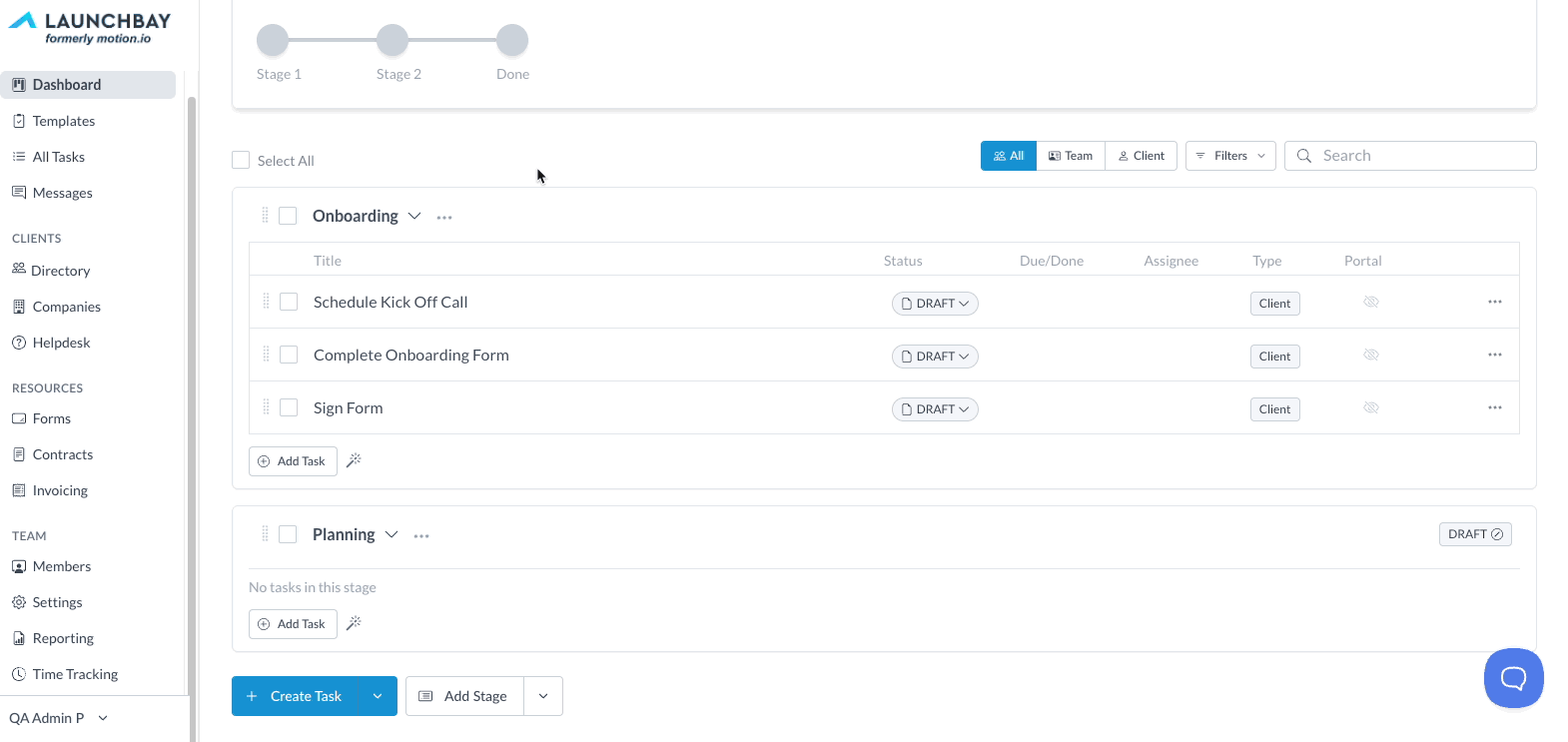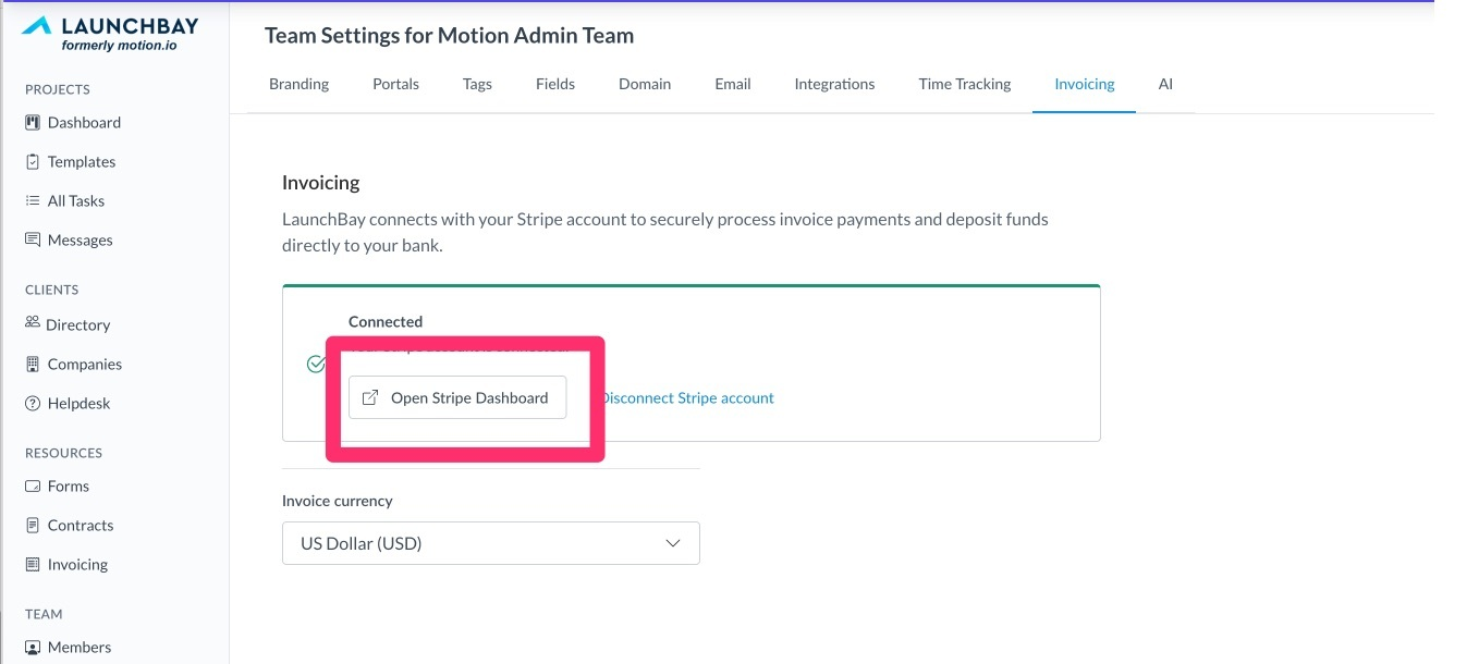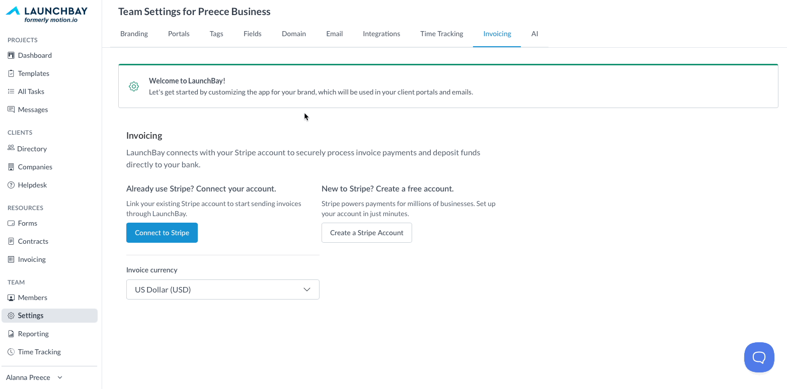 Once you connect your Stripe account, invoicing becomes a seamless part of your client experience—enabling you to attach invoices to tasks and get paid faster, directly inside LaunchBay.