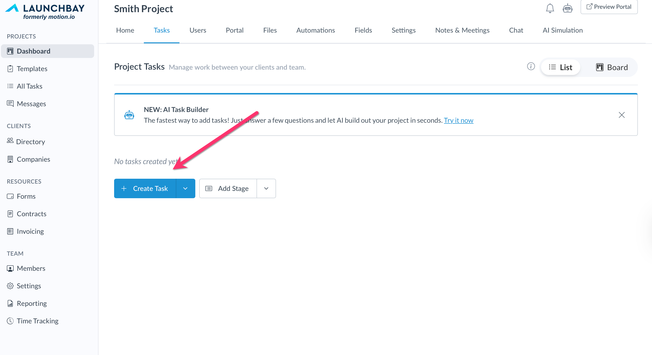 To create a Portal task, select a project and navigate to the Tasks page of that project. Next, click the button labeled "Create Task." When creating tasks in a brand new project, the Create Task button will appear near the center of your screen.