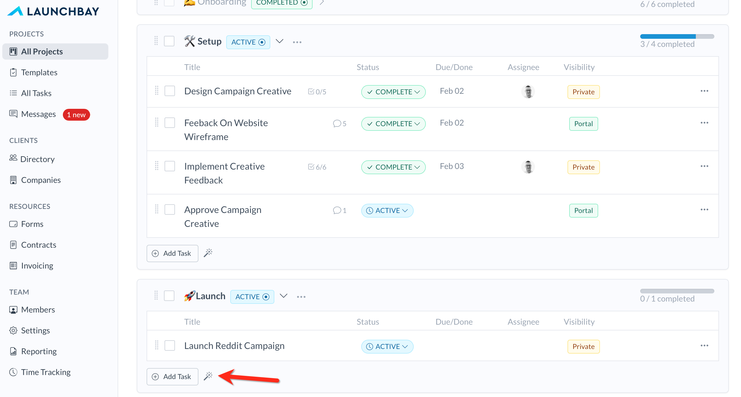 If you're creating tasks in an existing project where you've set up project stages, clicking the gray "Add Task" button in a stage will automatically assign the task you create to that stage.