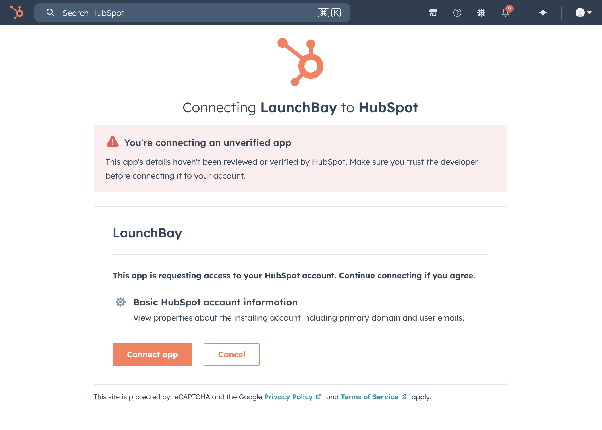 Note: LaunchBay's HubSpot integration was recently released and is pending approval on the HubSpot Marketplace. During this time, you will see a warning from HubSpot that you are "Connecting to an unverified app." You can safely disregard this message.