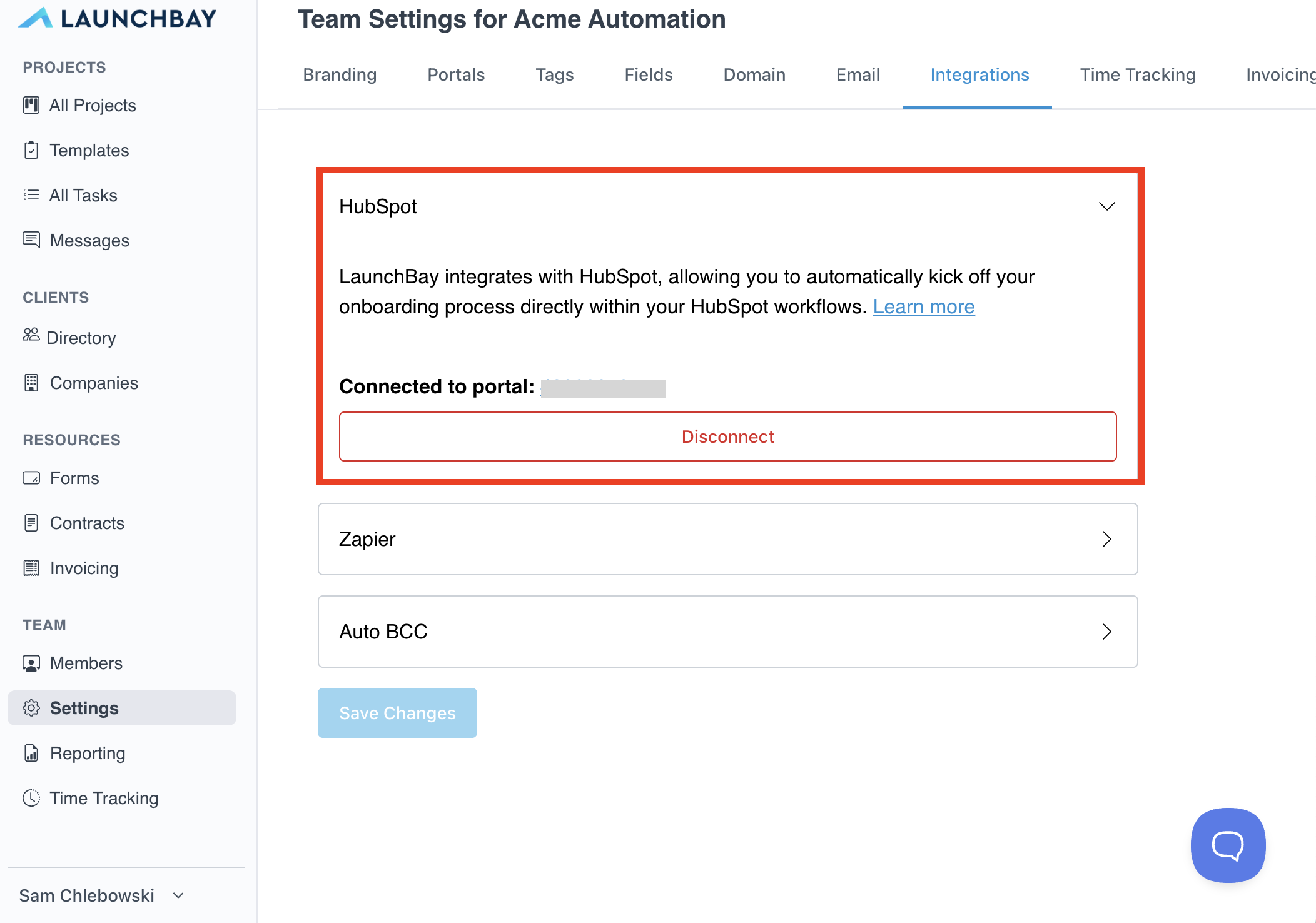 - After completing the steps in the HubSpot modal, return to LaunchBay to confirm the integration is live. If connected, the HubSpot section will display "Connected to Portal" along with a Portal ID.