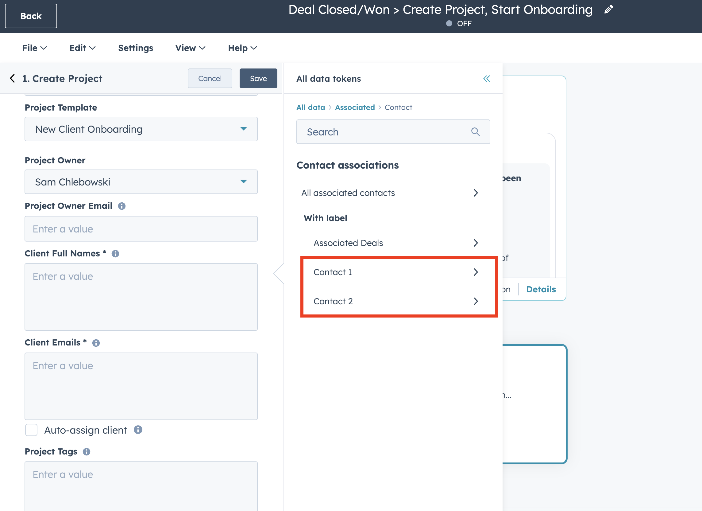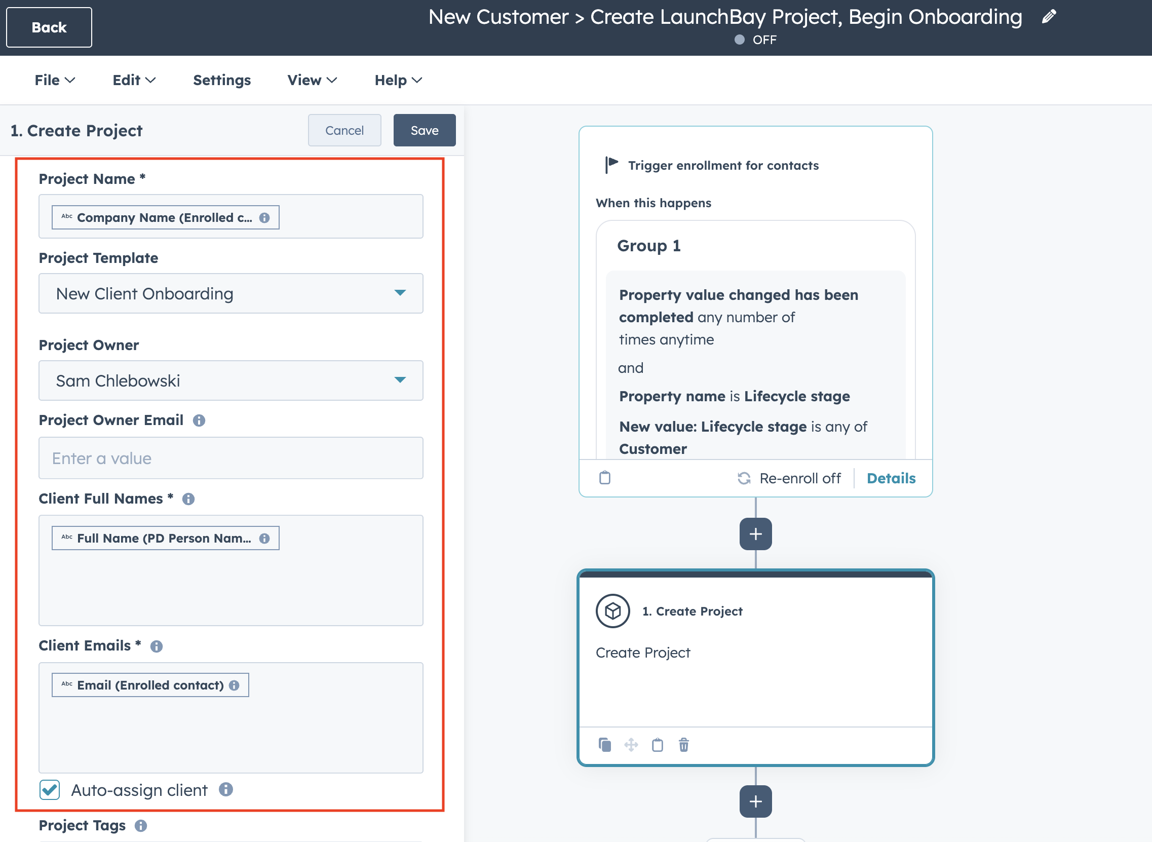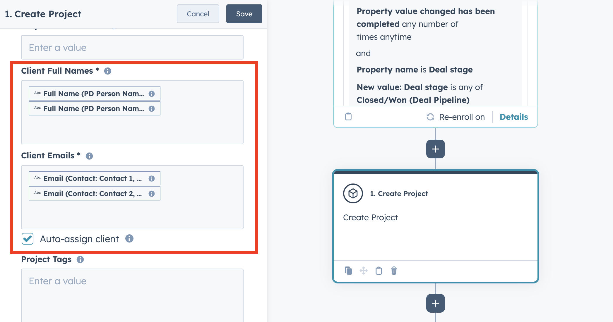 | Client Emails | Set this to the corresponding email field(s) from the trigger. The example in this guide populates the email of the contact whose lifecycle stage changed to "Customer." |