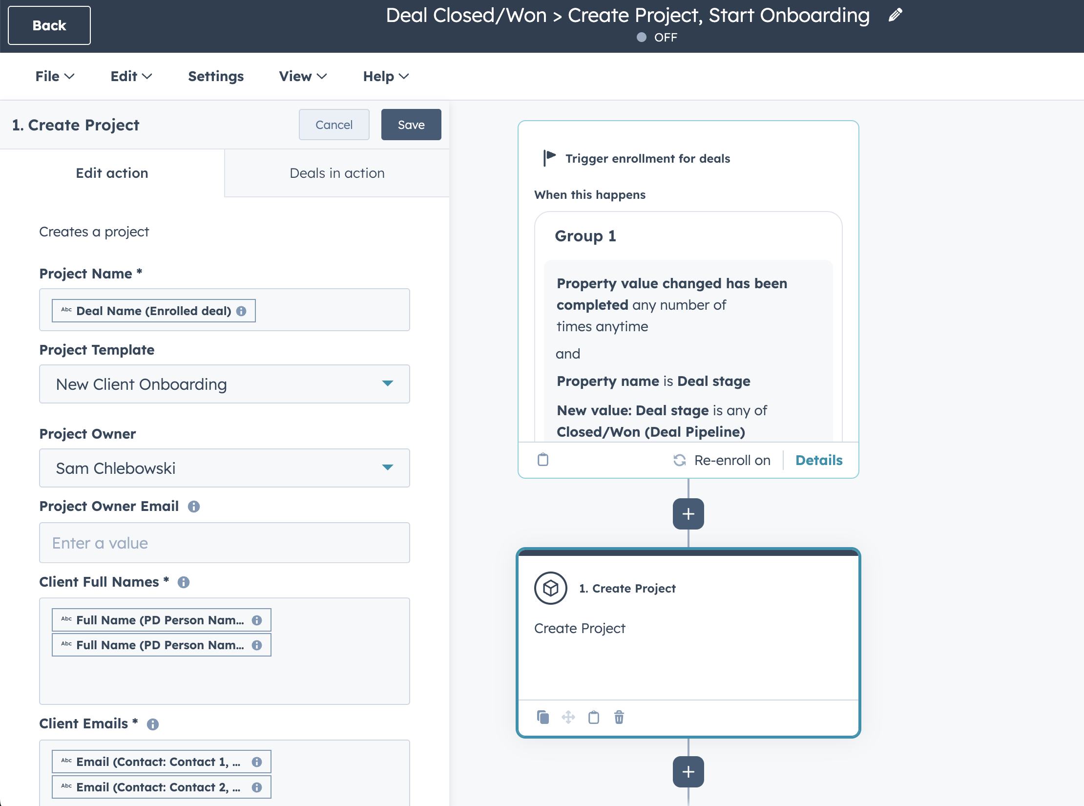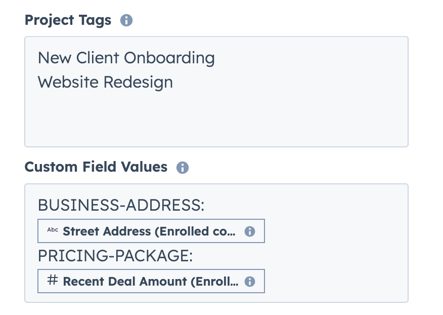 | Project Name | Defines the name of each project the action creates. For a dynamic name, map this field to a HubSpot property such as "Company," "Deal Name," or a custom property like "Project Type." |