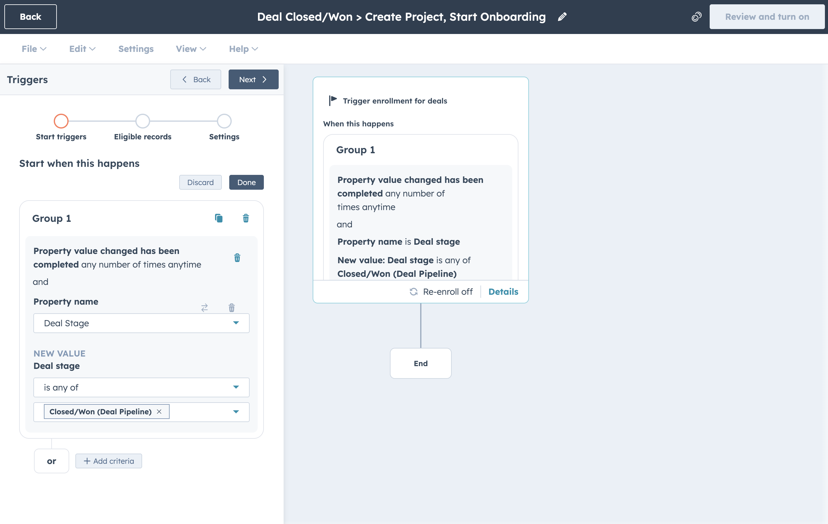 Step 1: Once your association labels are set up, create a new workflow and choose "Property Value Changed" as the trigger. Select the deal property you want to use. The example below triggers when a deal stage becomes "Closed/Won."