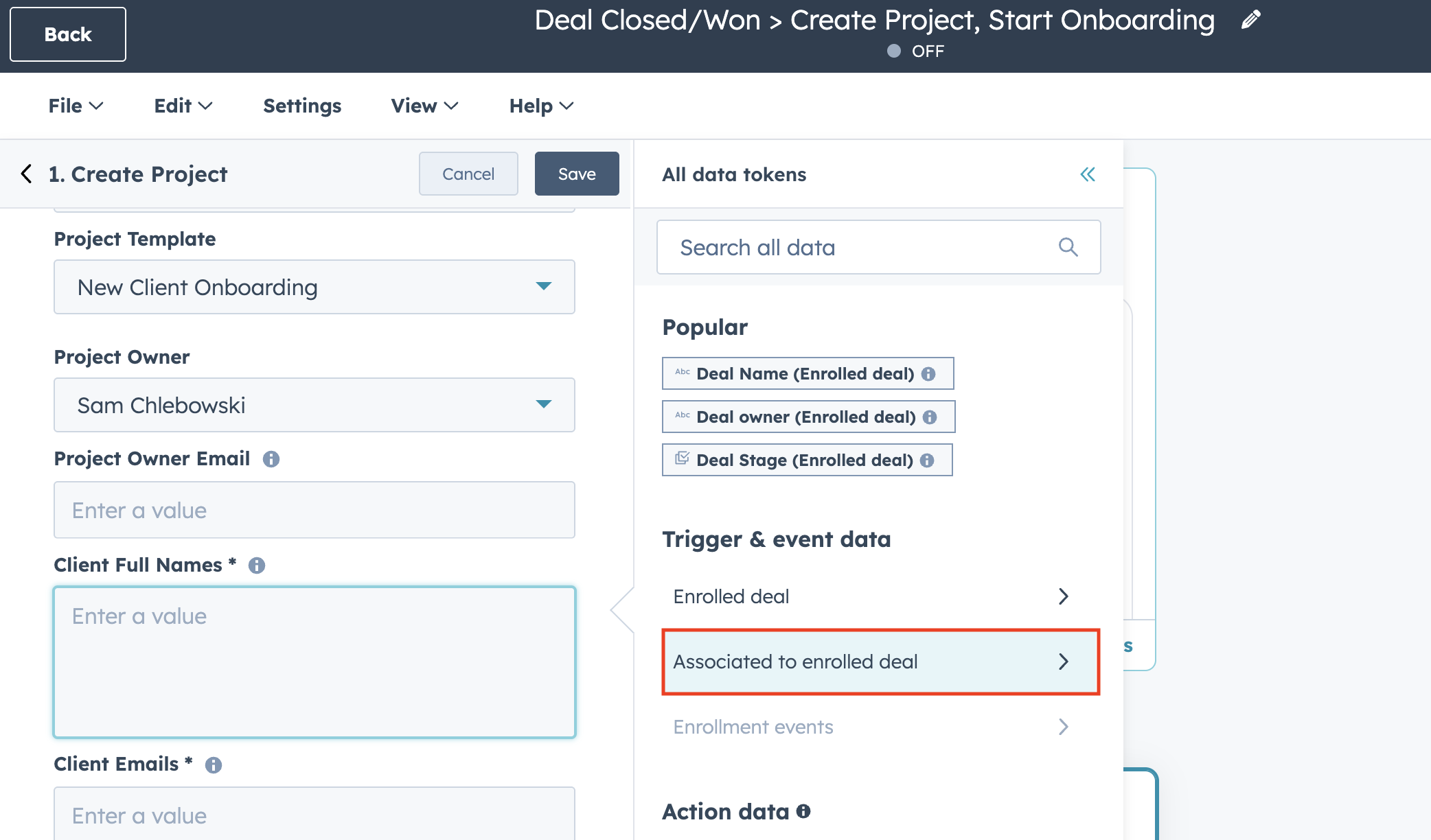 | Client Full Names | Set this to the corresponding name field(s) from the trigger. The example in this guide populates the first and last name of the contact whose lifecycle stage changed to "Customer." |