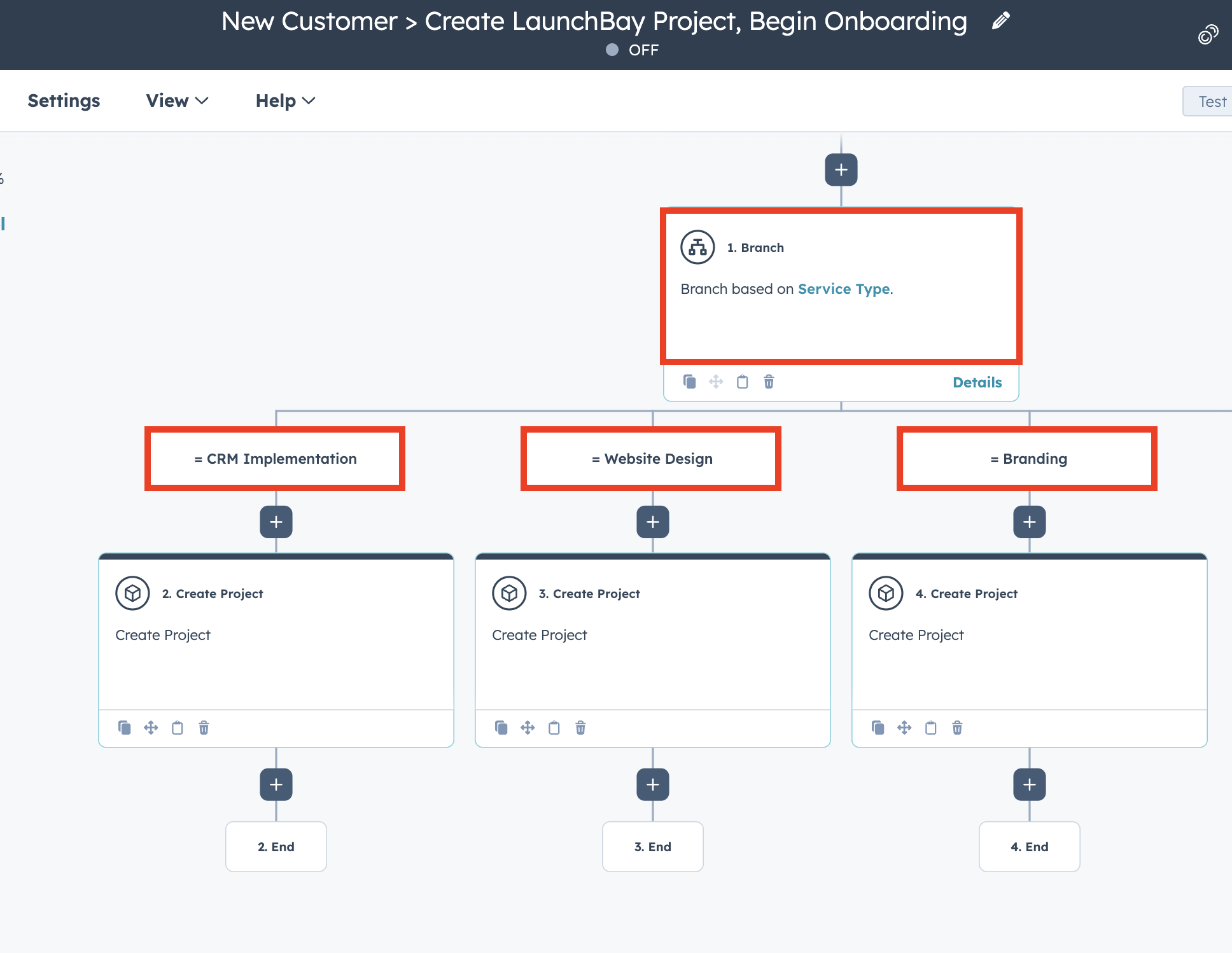For example, a custom HubSpot property called "Service Type" with options like "CRM Implementation," "Web Design," and "Branding" can route to the corresponding template in LaunchBay. When a client's "Service Type" is set to "CRM Implementation," the workflow creates a project from your CRM Implementation template.