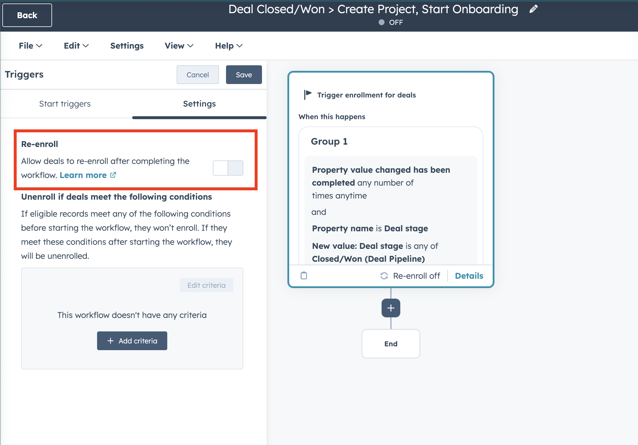 Tip: If you often invite clients to multiple projects and set up a workflow like the one described above, turn on the "Re-enroll" toggle to allow contacts to enter the workflow again and be added to new projects.