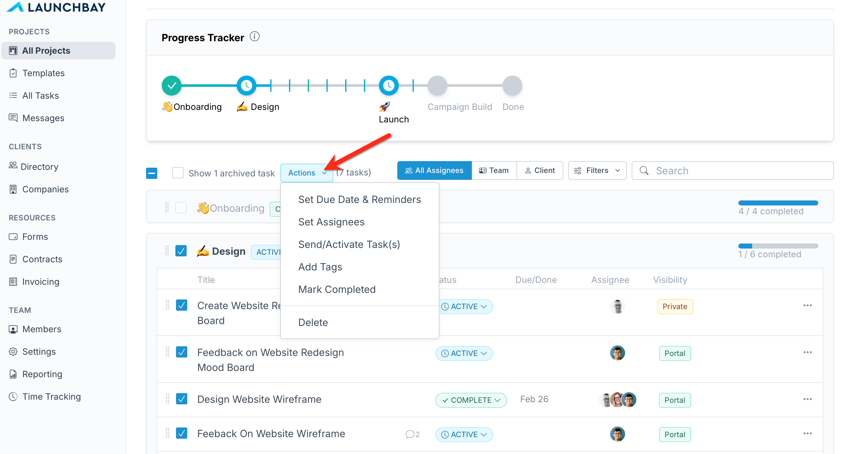 In your LaunchBay projects, the "Bulk Actions" dropdown provides a quick way to edit, assign, or send multiple tasks in that project simultaneously.