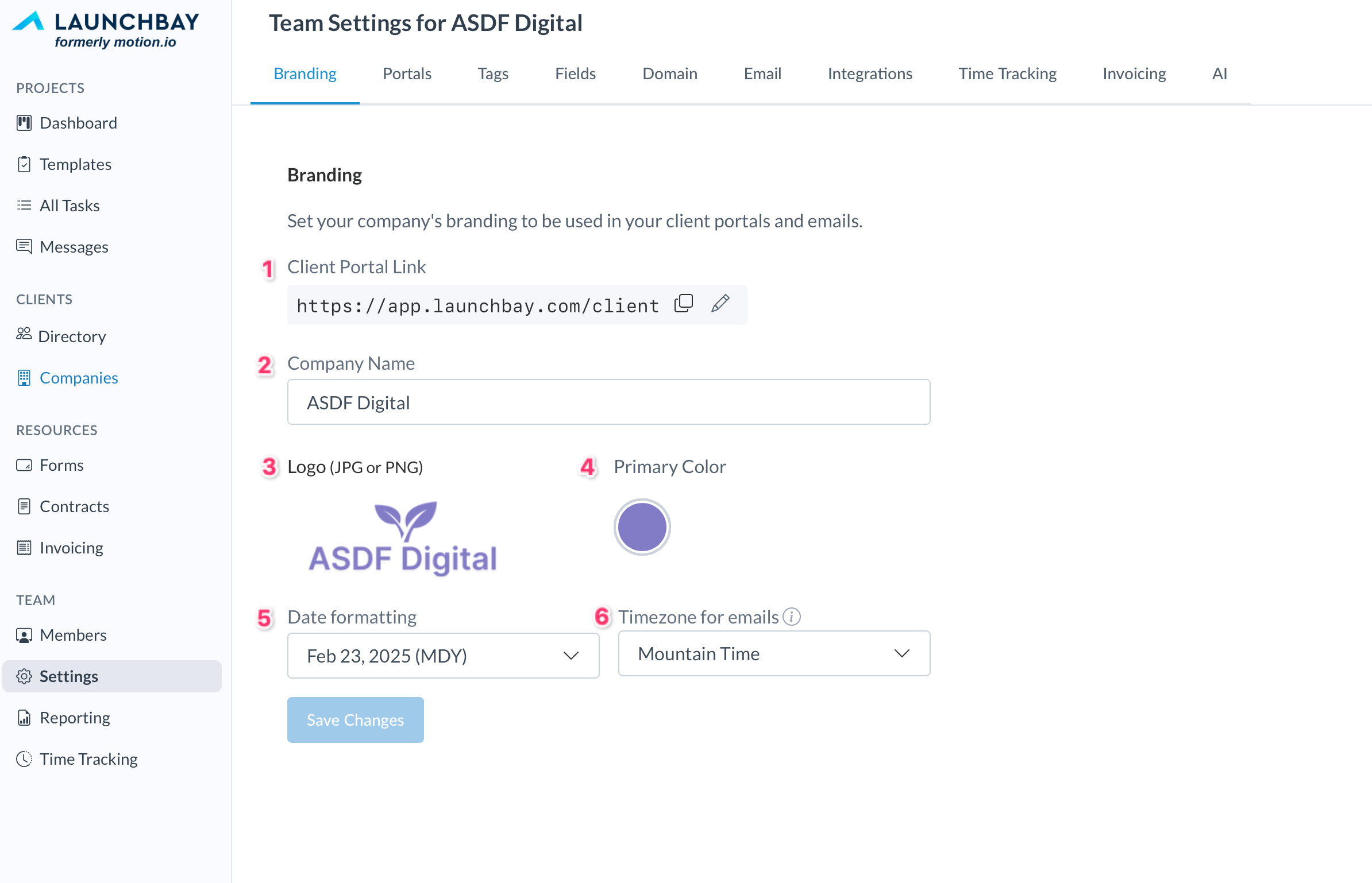 You can change the date format used for projects and client portals account-wide by selecting an option from the Date formatting dropdown.