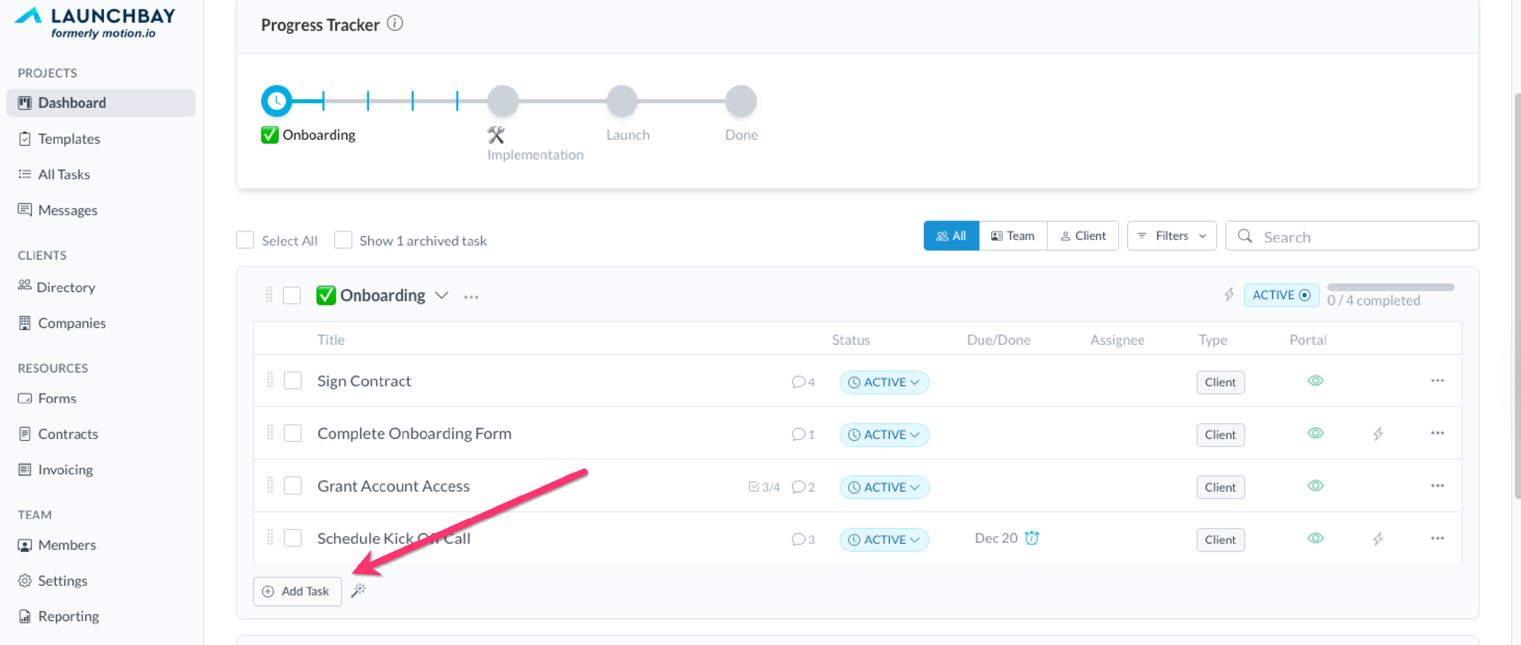 👋 Tip: In the "Tasks" tab of your LaunchBay projects, any tasks set up to send automated reminders will display a clock icon next to the due date.