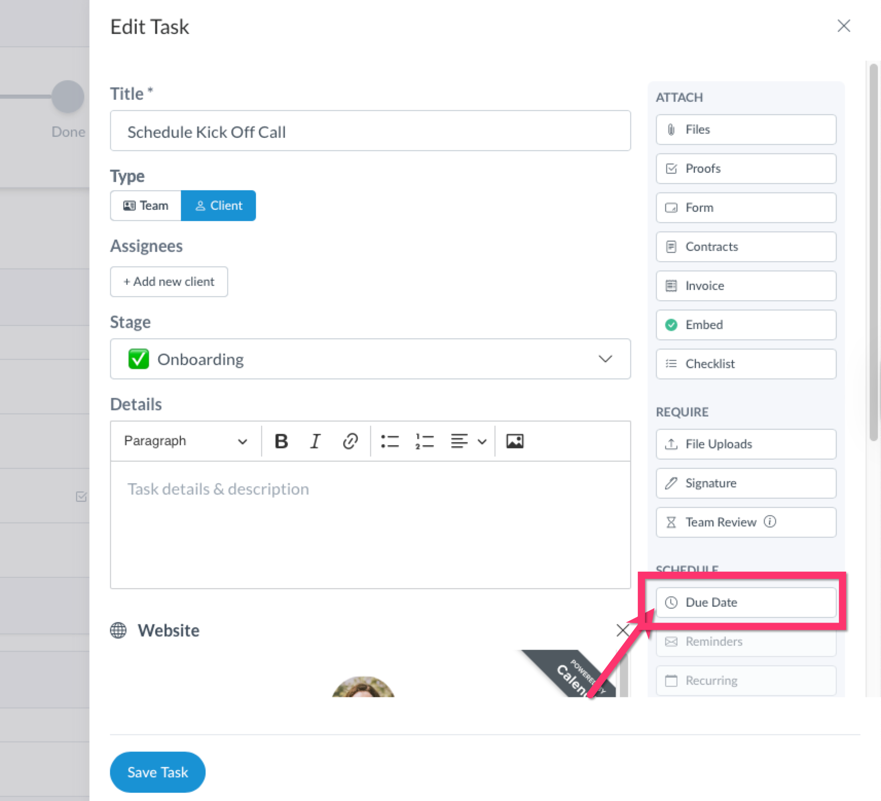 After entering your information for the task, set a due date by clicking "Due Date" on the right side of the task composer.