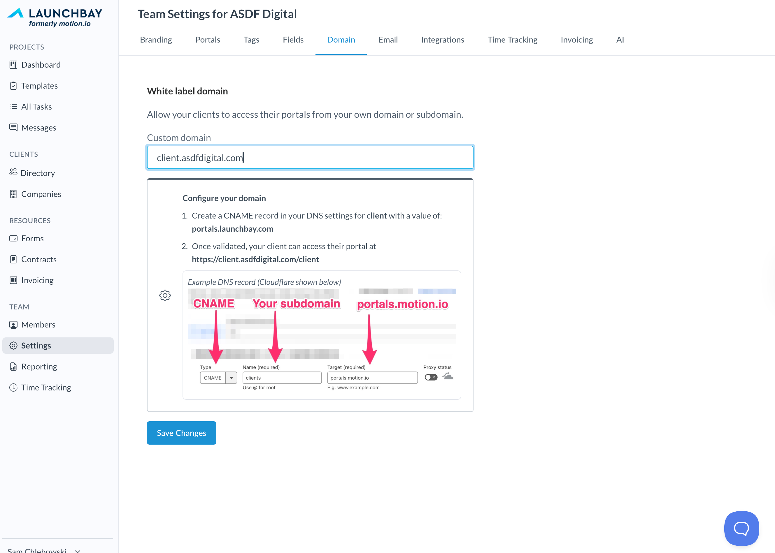 To configure your white-label settings in LaunchBay, click "Settings" from the sidebar on the left, which will bring you to your account's Team Settings page. From here, the Domain and Email tabs will allow you to access all the necessary settings to fully white-label your LaunchBay projects and client portals.
