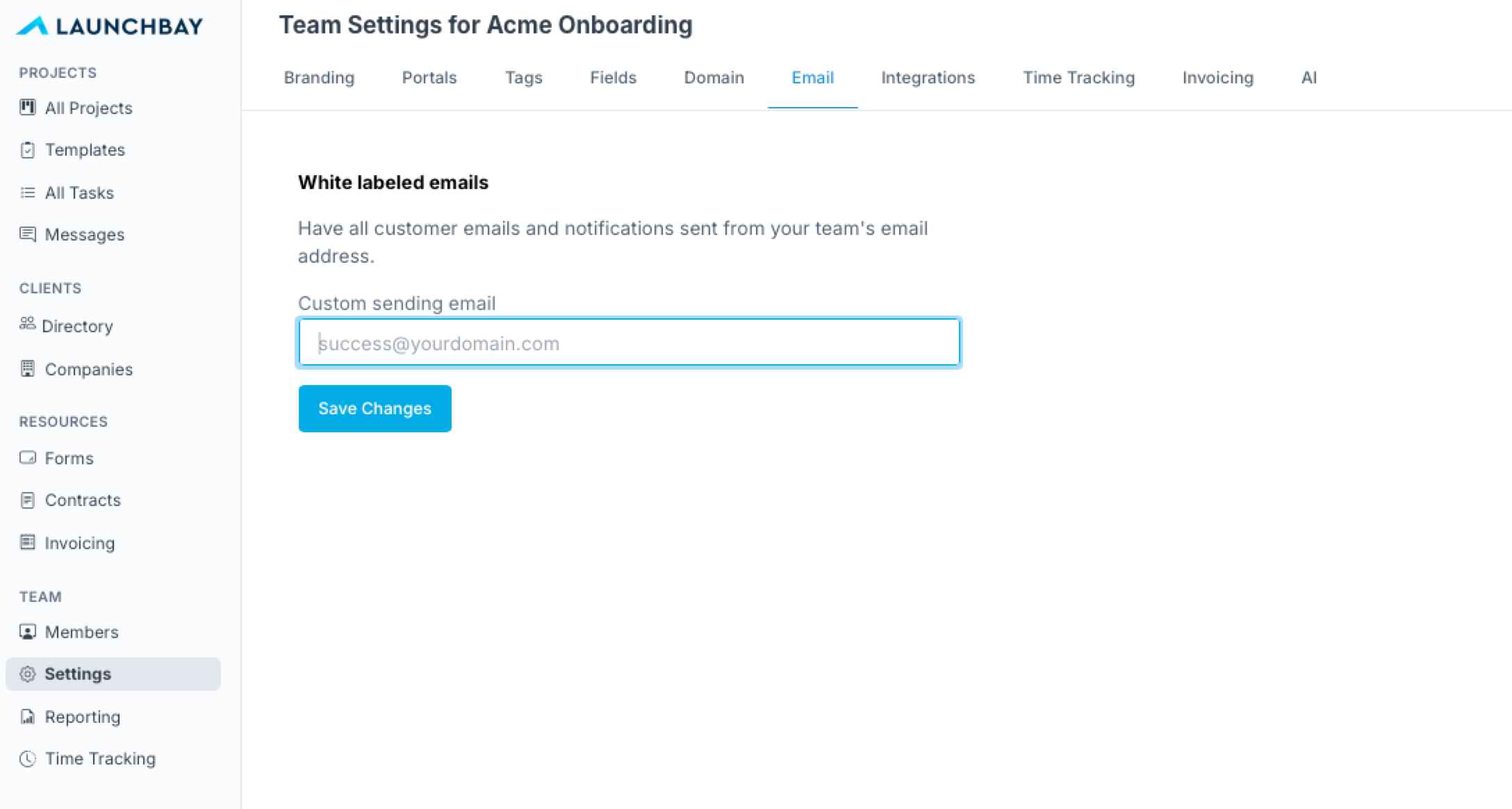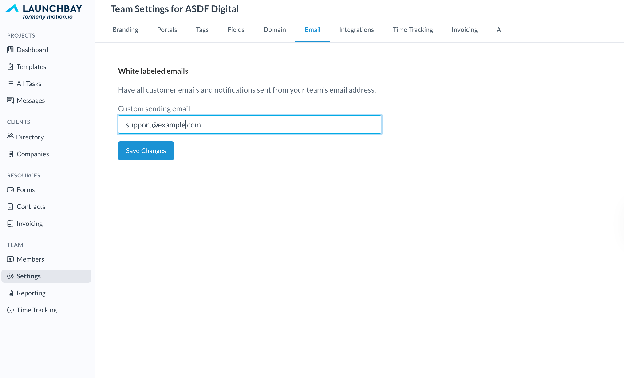 To specify the email address from which you'd like clients to receive notification emails, click the "Email" tab of your account's Team Settings page and enter an email.