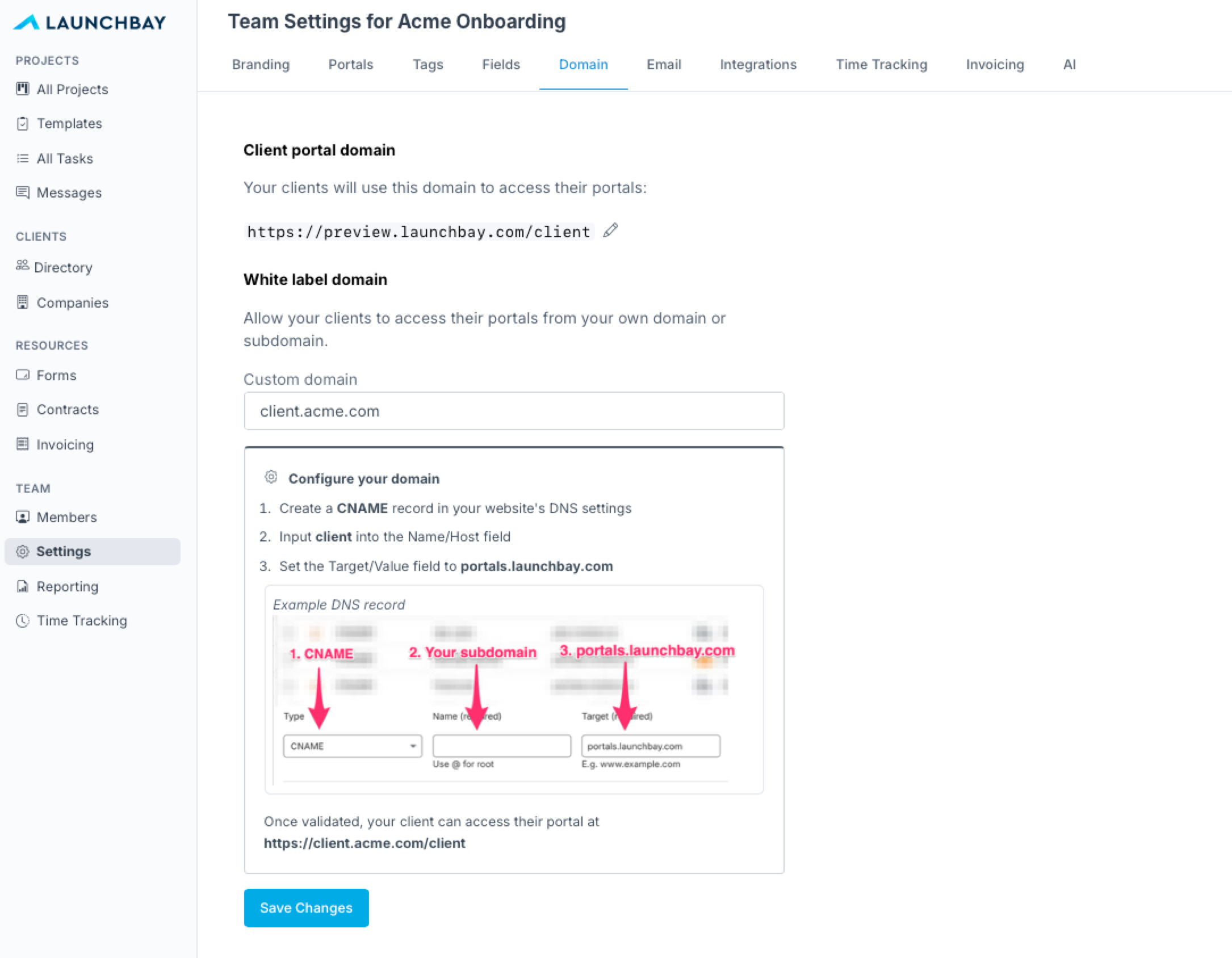 📢 Note: When adding the CNAME record to your domain host, all users will enter portals.launchbay.com as the target. The variable that will change depending on your business is the subdomain prefix. For example, if in your LaunchBay account, you enter clients.mybusiness.com , you'll enter the subdomain clients when creating the CNAME record in your domain host.