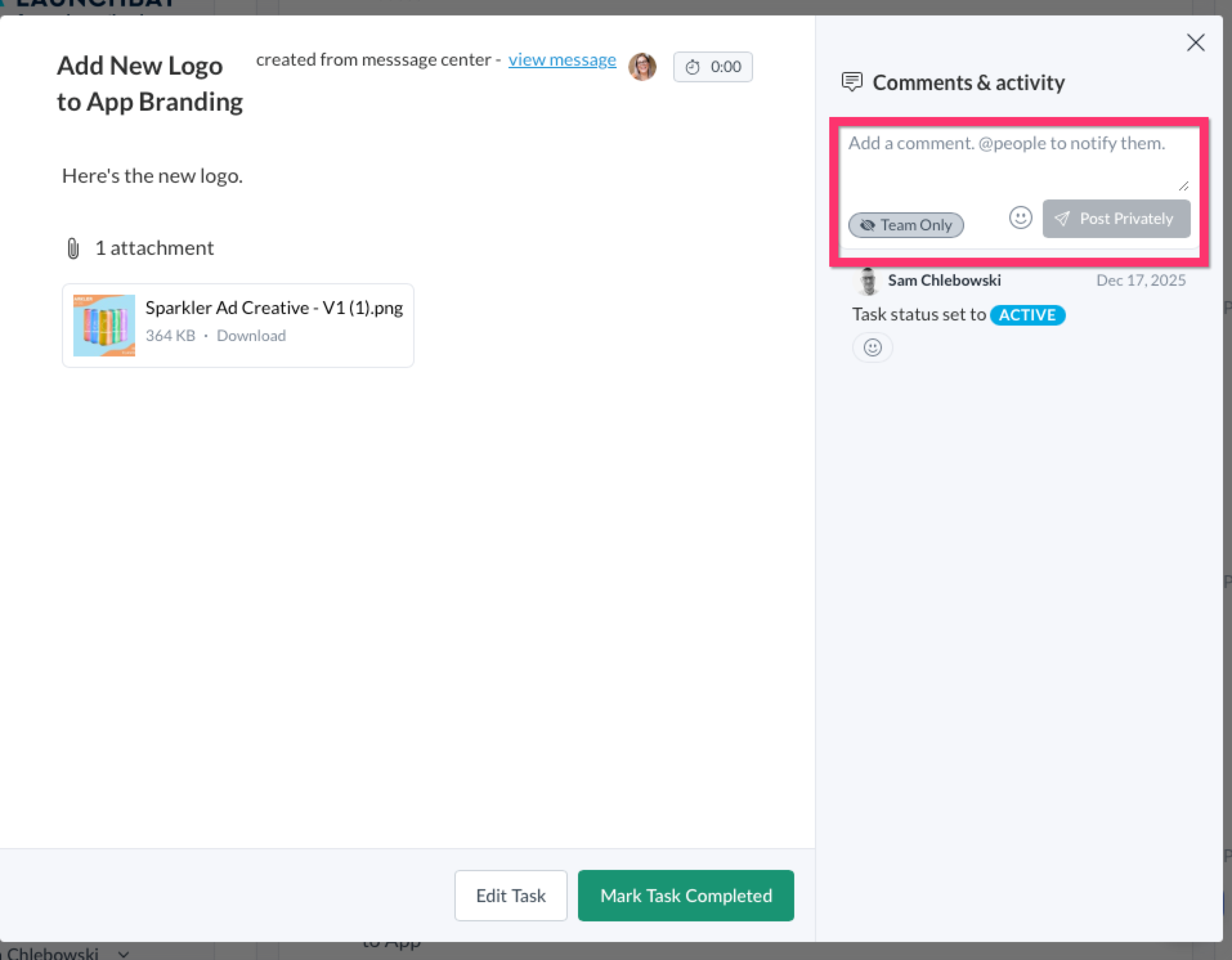 Instead of using separate platforms for client-facing and internal team collaboration, LaunchBay's Team Tasks are internal tasks that empower your team to manage all communication, tasks, and files related to client projects in one place.