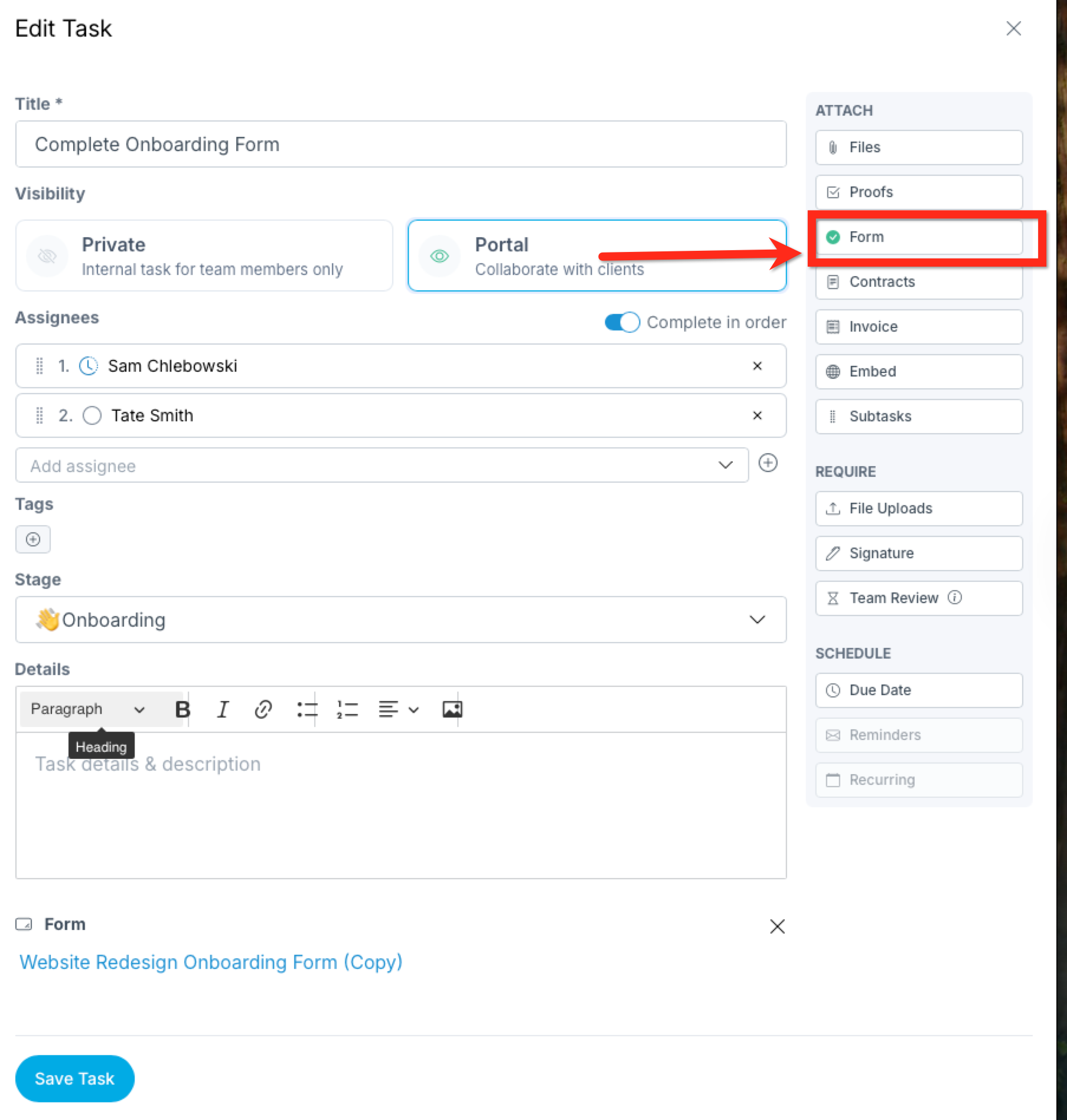 👋 Tip: Before you attach forms to tasks, you first need to create the forms you'll be using. Click here to learn more.