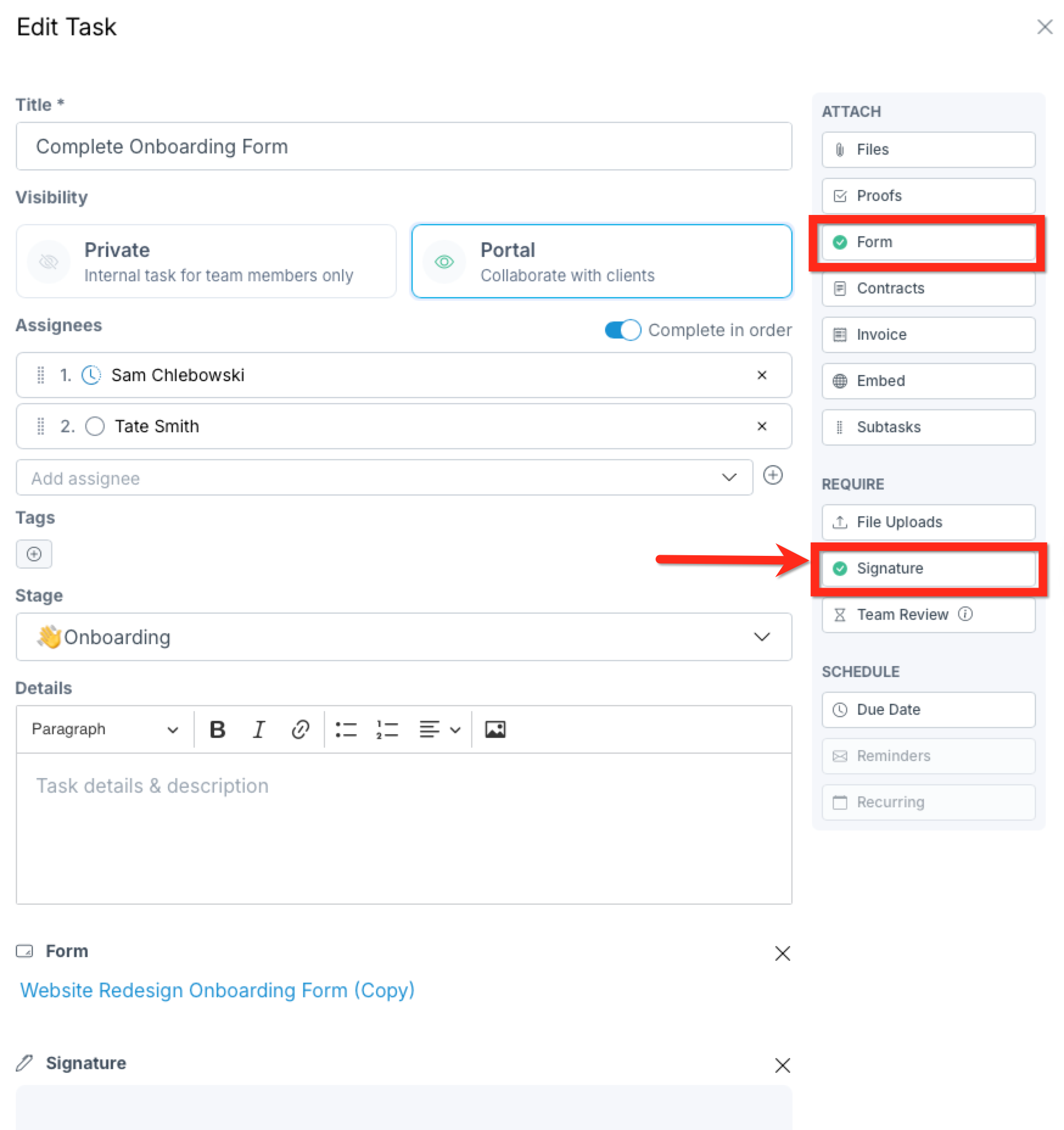 After attaching a form to a portal task, you can click on the "Signature" task option to automatically add a signature field to the bottom of your selected form.