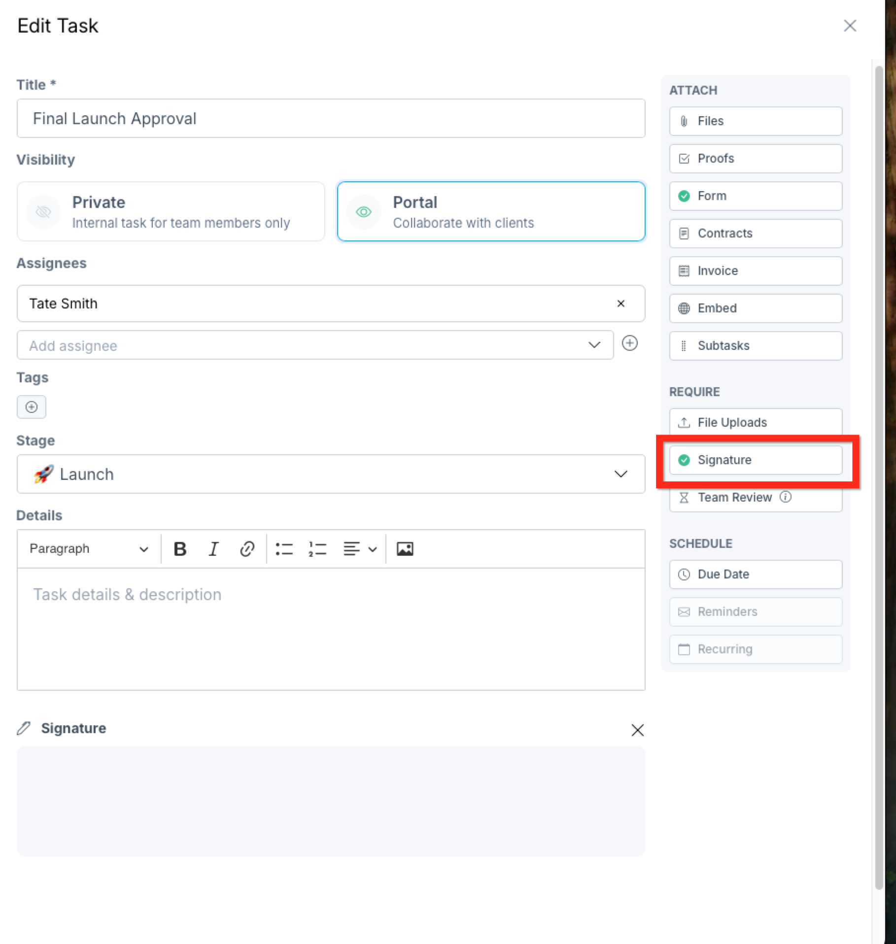 Once you have a task built out with all the information attached, click the "Signature" option in the Required section of the Task Builder. This will add a signature field to the bottom of your task.