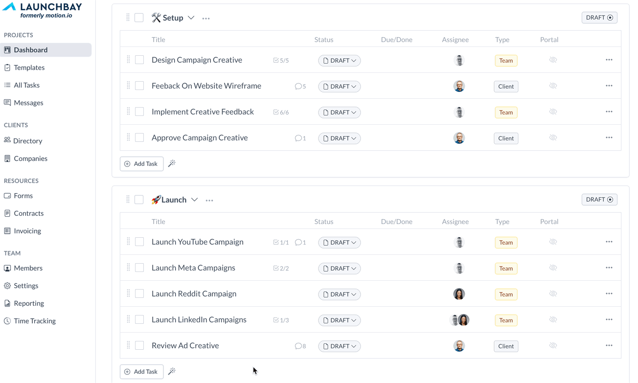 So you can create and modify client tasks in your LaunchBay projects without clients seeing them until you are ready; both Client Tasks and Internal Tasks are automatically set to the "Draft" status and not visible to clients in their portals until you send them.