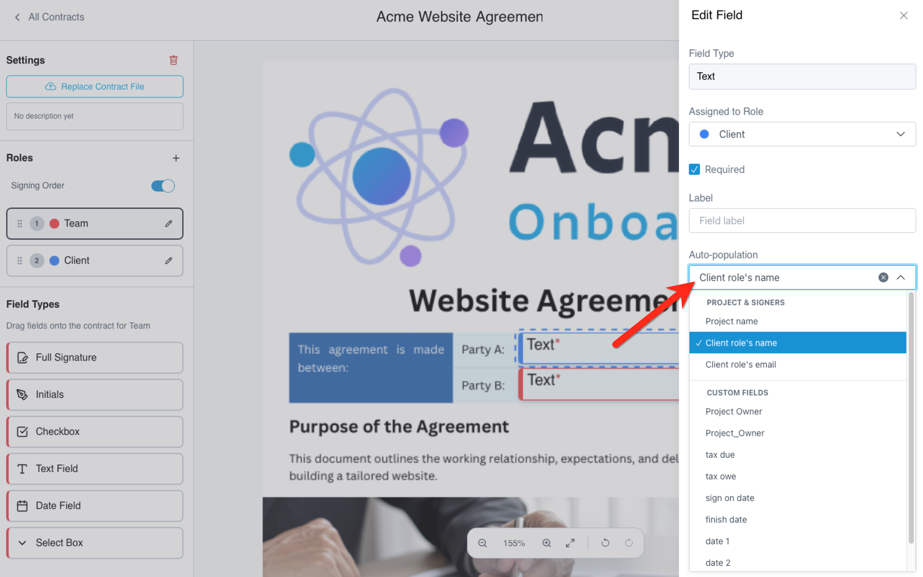In the editor, select the text field you want to add one of your custom fields to. Then, under "Auto Population," select the custom field or default field you wish to populate this contract field. Click "Done" to exit the modal and click "Save Template". You can use a custom field to populate as many fields in the contract as you need.