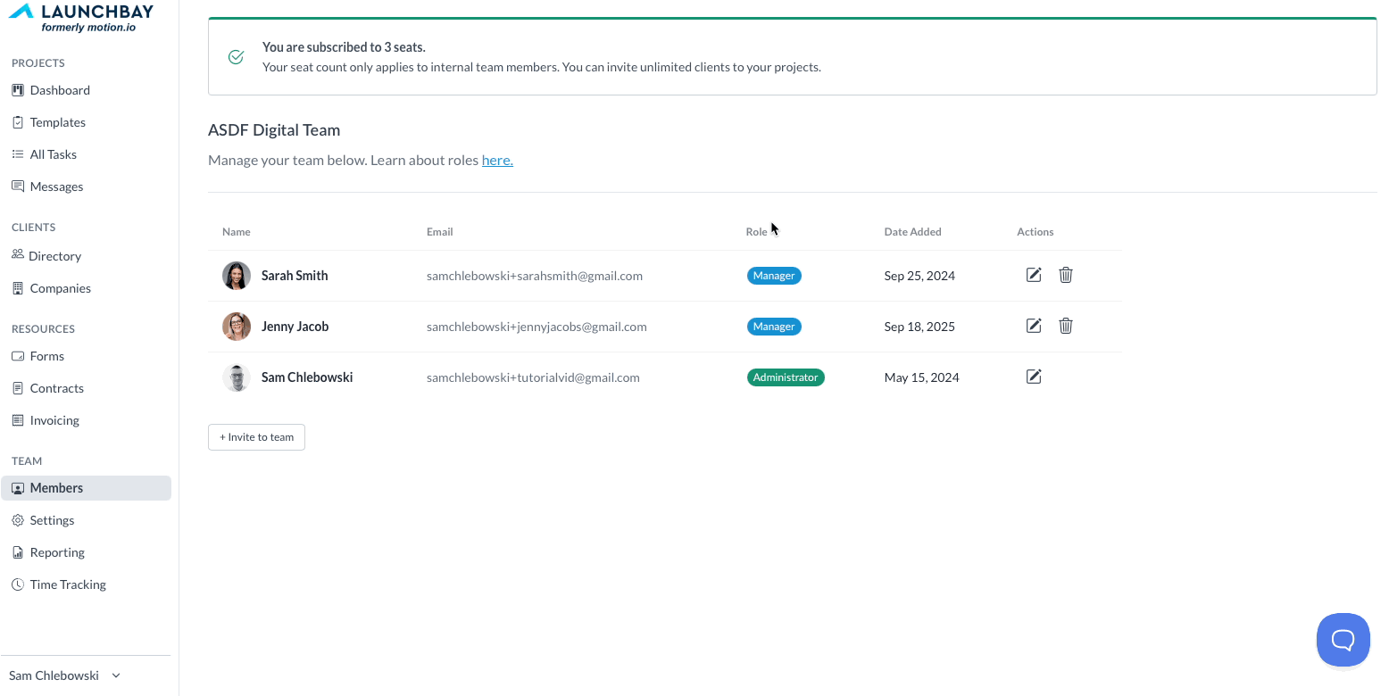 In almost all cases, you'll want to give everyone on your team involved in client-facing work access to your LaunchBay account so they can download files and access information within projects. This article describes the process for inviting new team members and details the four roles you can assign to team members.
