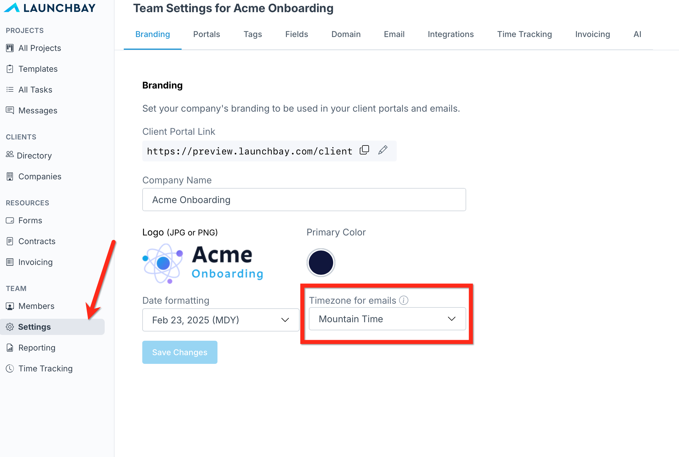 To change the time zone LaunchBay uses to something other than the default, navigate to your account's "Settings" page and use the dropdown under "Timezone for emails" to specify a different time zone.