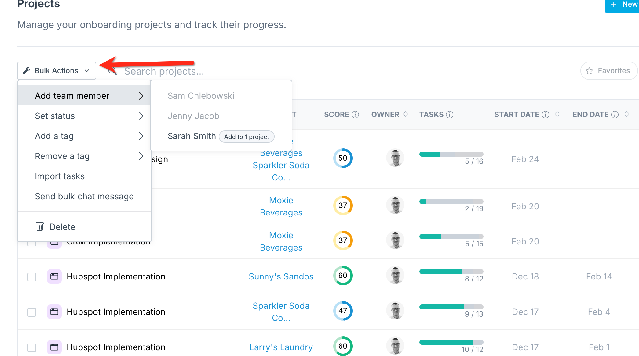 To do this, click the checkbox on the left side of each project, select the "Add team member" option from the "Bulk Actions" dropdown, and choose the team member you want to add.