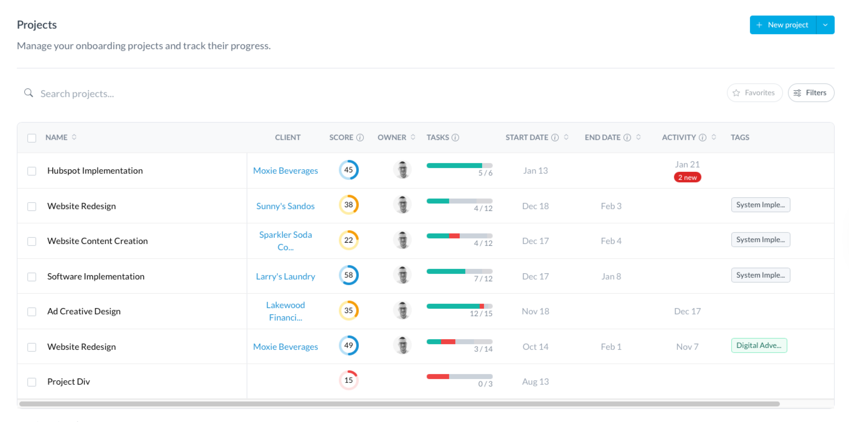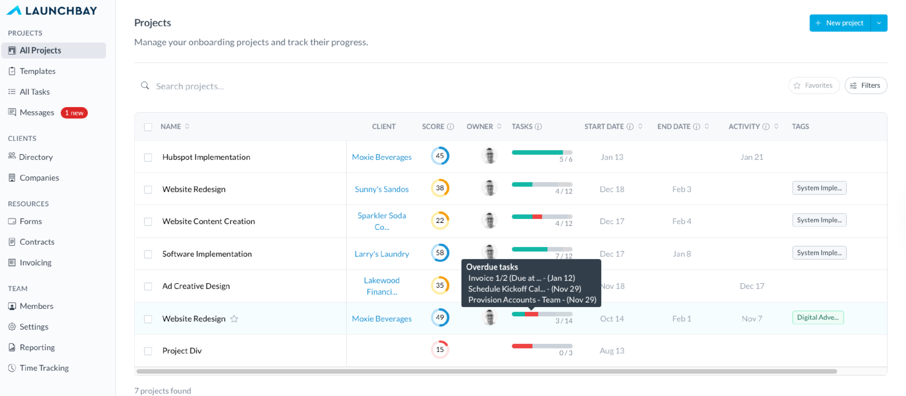 The "Tasks" column in the Projects Dashboard displays a progress bar, with blue indicating the number of completed tasks and red indicating overdue tasks. Hovering over the red section of the progress bar will give you insight into which specific tasks in the project are overdue.