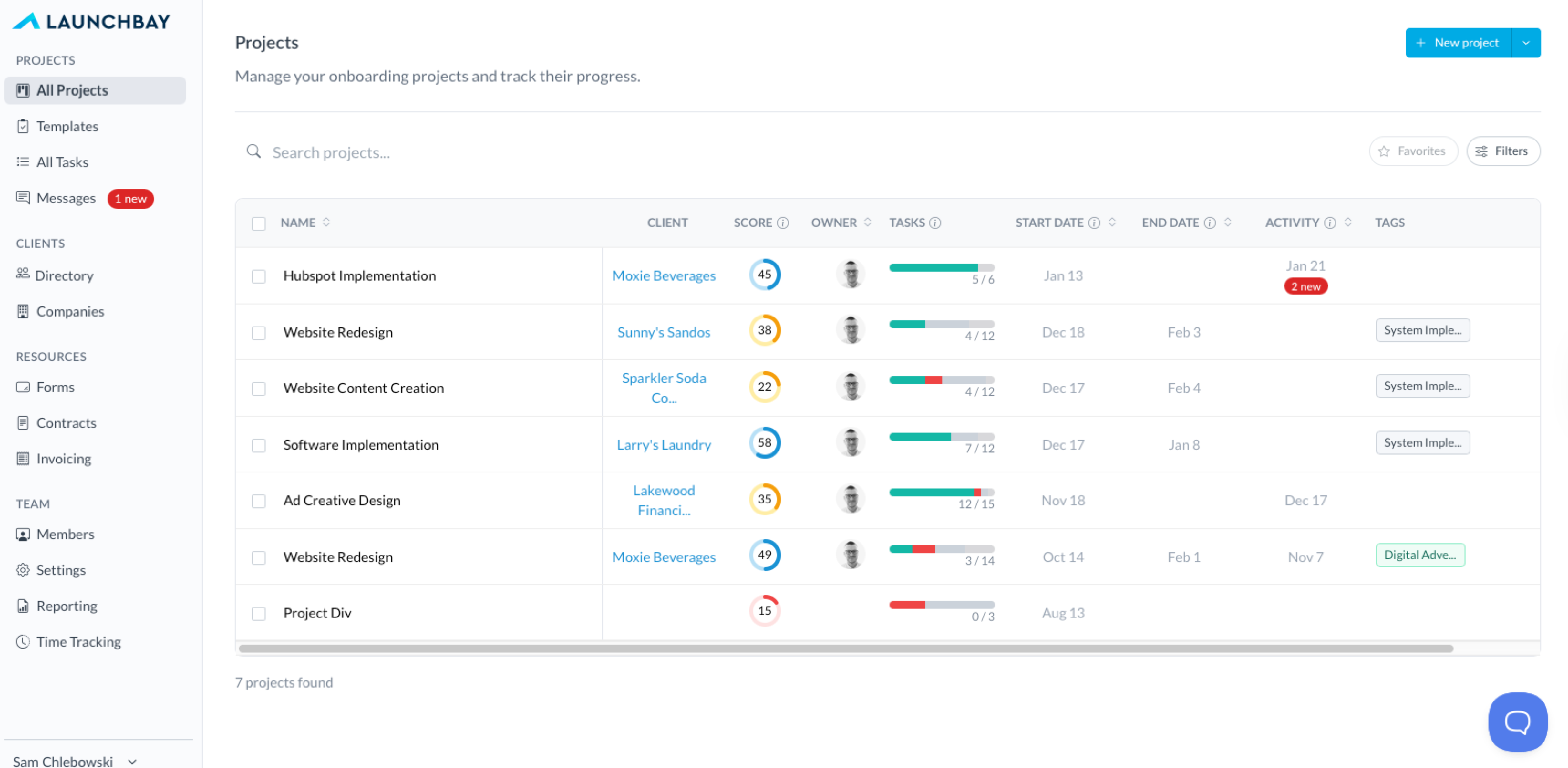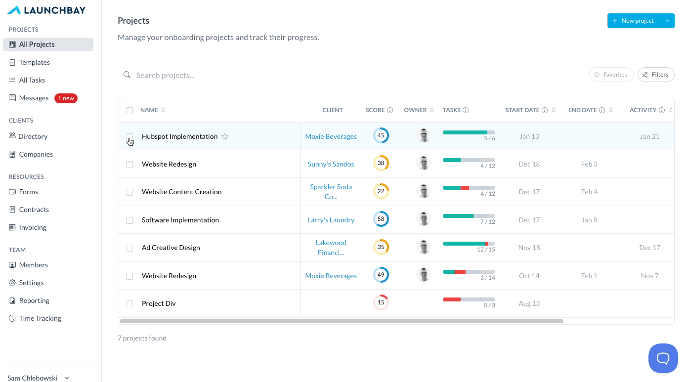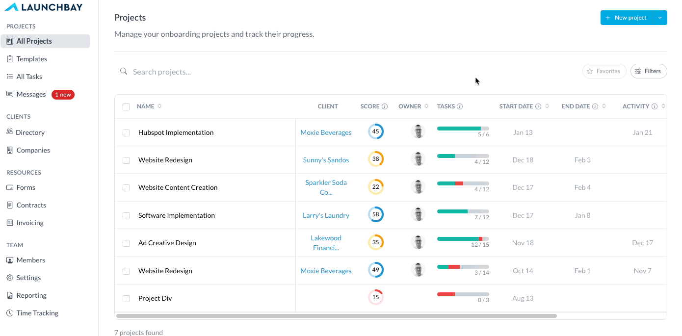 In LaunchBay, the Projects Dashboard provides your team with a quick way to access the status, activity, and other important information about each project you manage in one centralized view.
