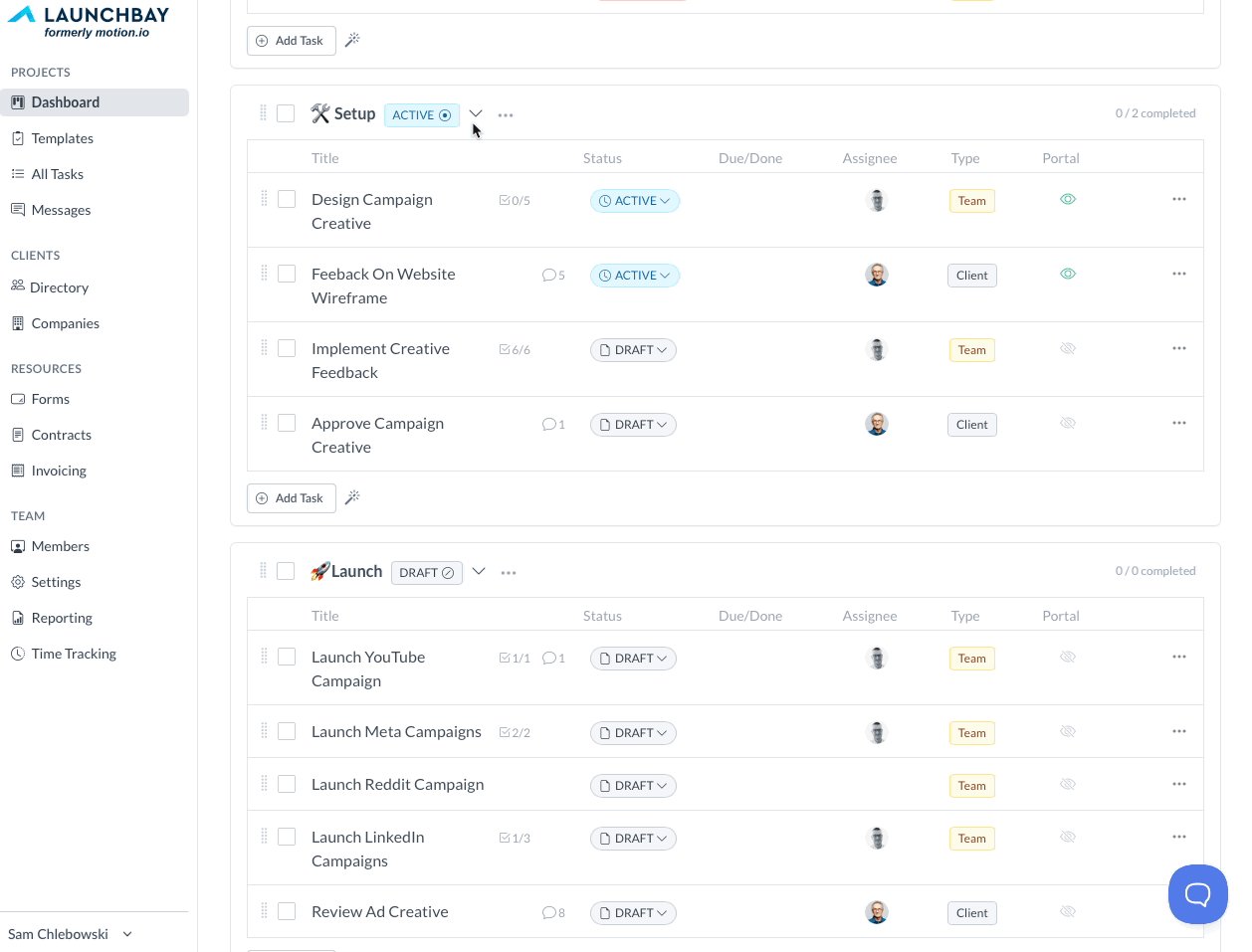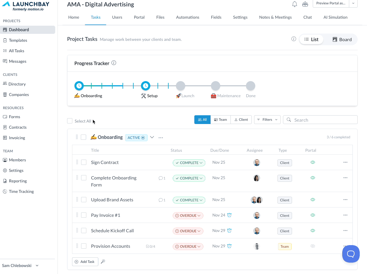 When you create a project (either from scratch or from a template), LaunchBay automatically includes a Project Progress Tracker clients can access from their portal's "Tasks" page.