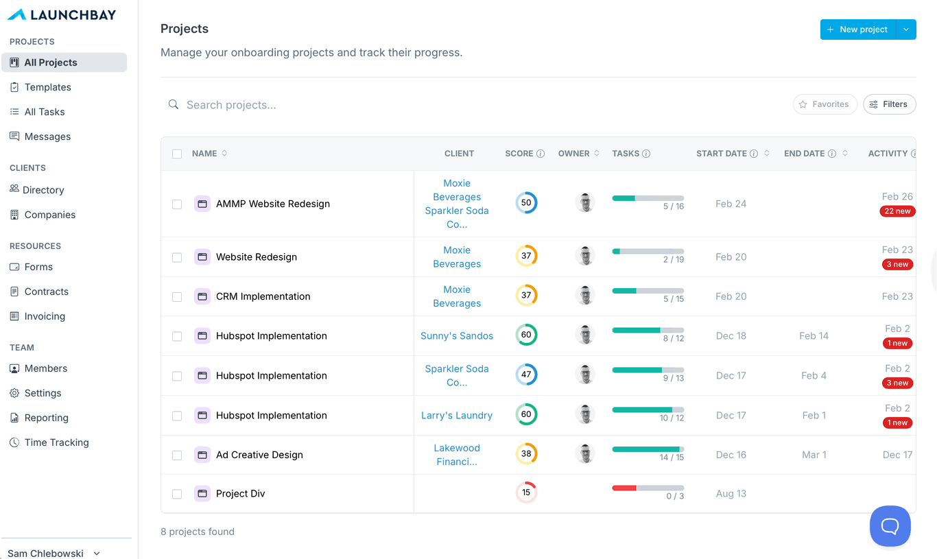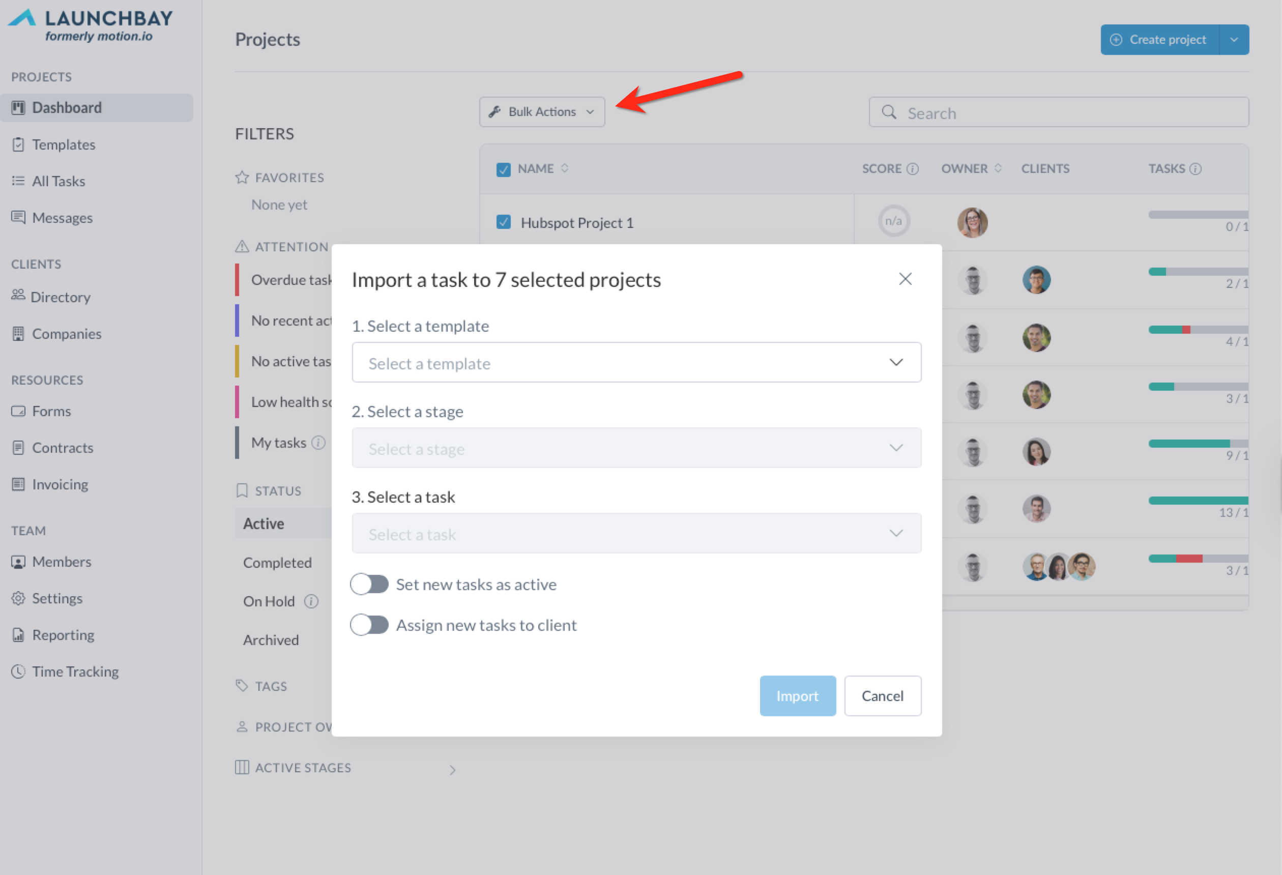 The "Import Tasks" bulk action enables you to import pre-created tasks (or entire project stages) from your LaunchBay templates, assign them to clients, and send them simultaneously to multiple projects.
